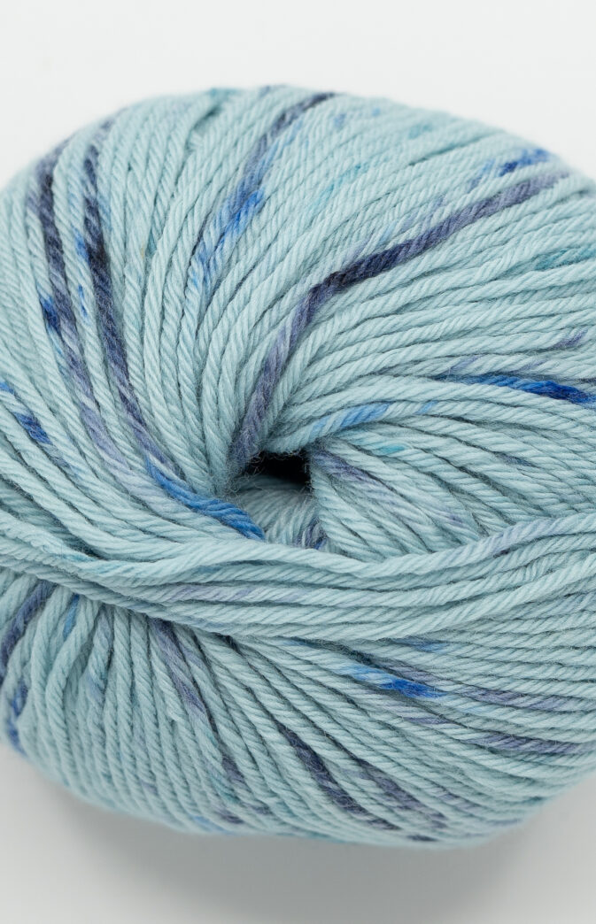 Pop Merino håndfarget garn: Garnet er håndfarget for å gjøre hvert nøste spennende og unikt. For en annerledes og kul effekt på strikkaplaggene! Lek deg med strikk og skap magi med nydelig flerfarget spettet garn! Lysblå med fargede dryss.