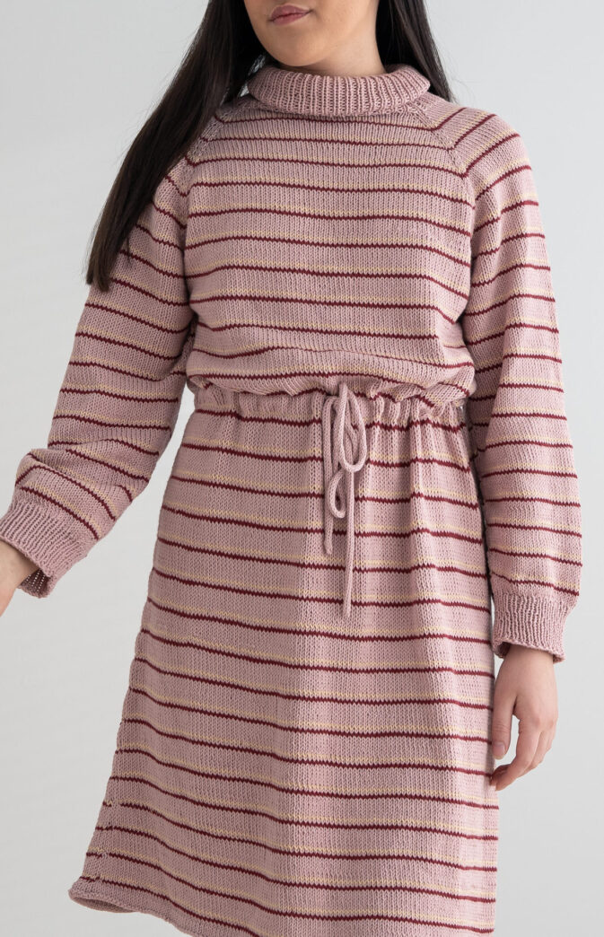 Strikkeoppskrift på kjole i bomull til dame. Strikkes ovenfra og ned. Velg å strikke med eller uten høy hals. Snor i midje for en behagelig og avslappet passform.