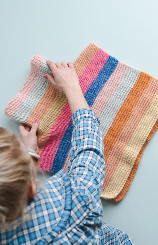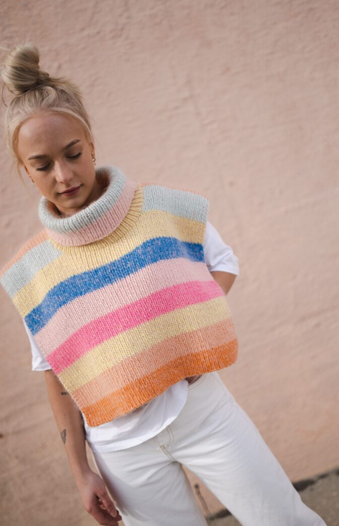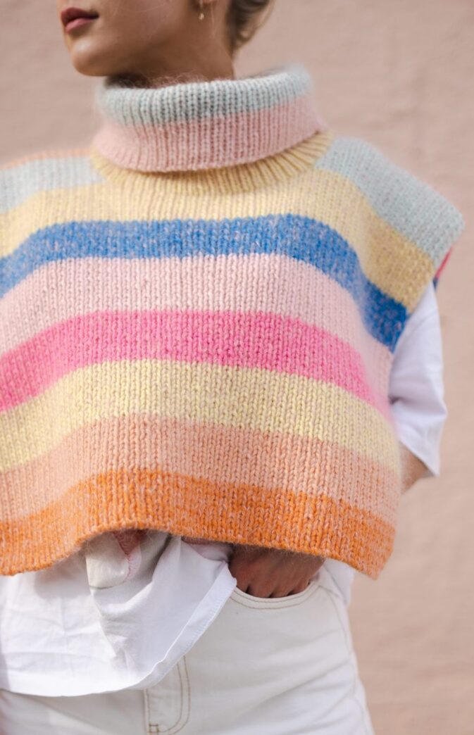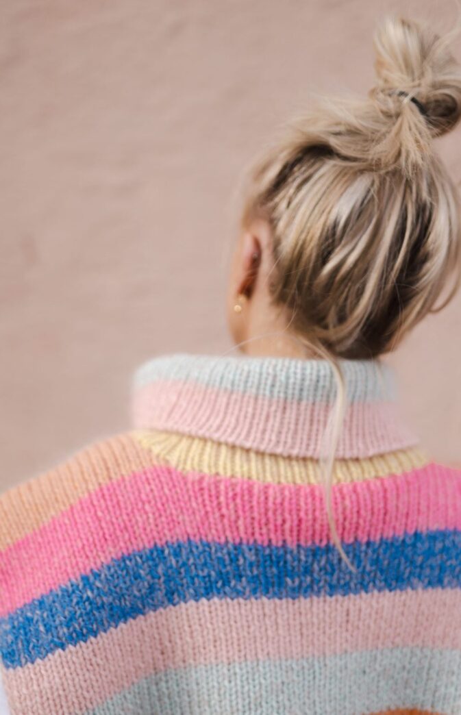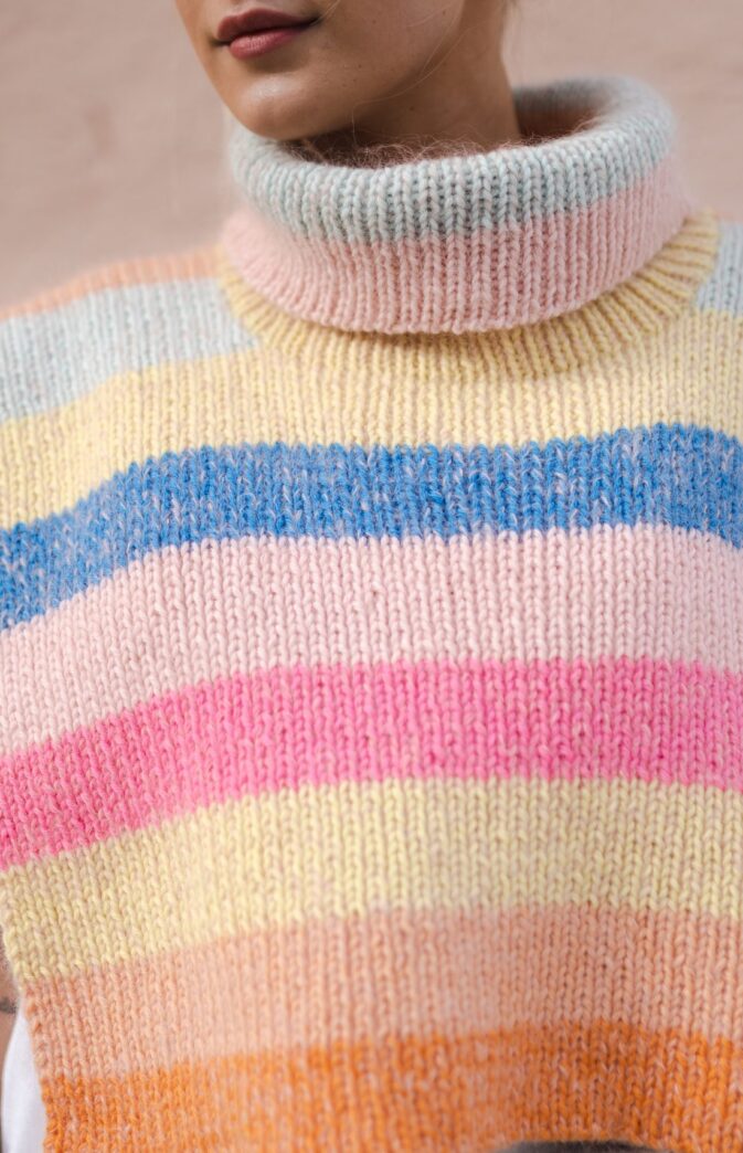 Avbildet i 1 tråd «Candyfloss» Hip Mohair holdt sammen med Pop i fargene: «Cheesecake» (2 nøster), «Soft Peach» (1 nøste), «On Fire Orange» (1 nøste), «Hint Of Mint» (1 nøste), «Peaceful pink» (1 nøste), «Falling for you blue» (1 nøste), og «Pink Crush» (1 nøste).