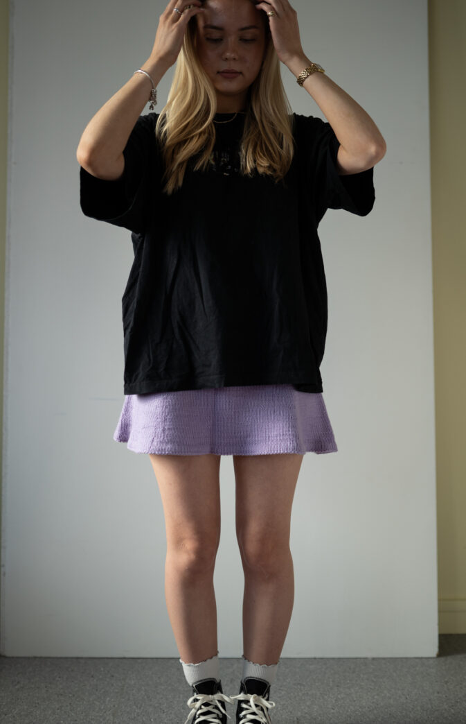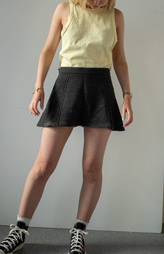 Miniskjørt strikket i vår myke Pop Merino. Skjørtet strikkes ovenfra og ned og har en A-fasong som går ned til midt på låret. Det er fire falske sømmer på skjørtet, to i front og to bak – som gir en fin detalj til den klassiske glattstrikken. Velg mellom tre forskjellige lengder.