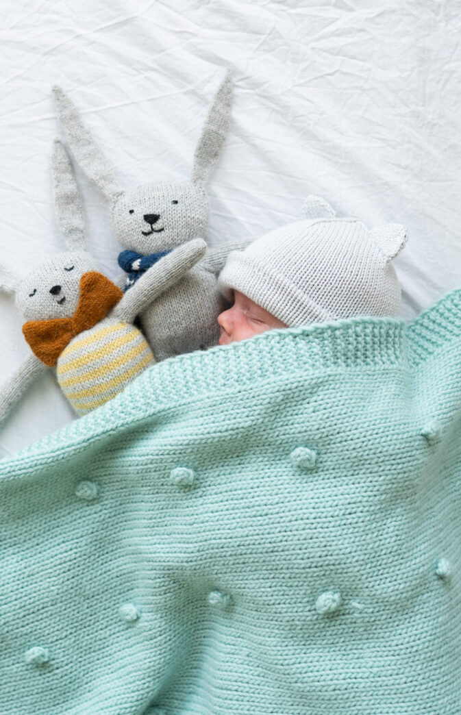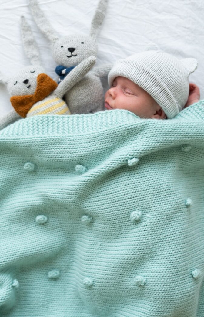 Strikkepakke med garn og gratis digital strikkeoppskrift. Enkelt babyteppe. Søtt babyteppe med små popcorn! Strikkes frem- og tilbake, med små «bobler» / popcorn spredt på teppet. Videoinstruksjon på vår YouTube kanal.