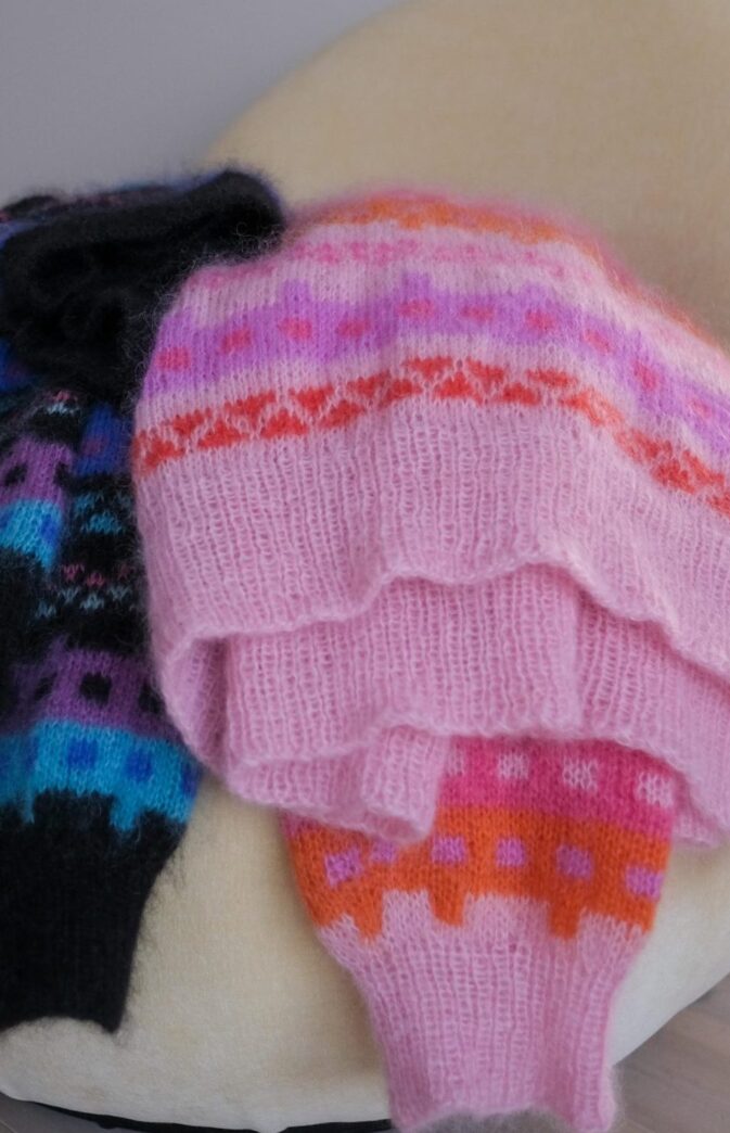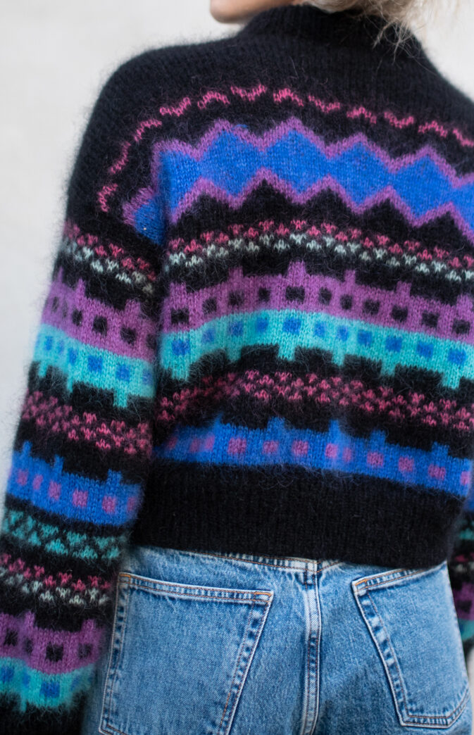 Avbildet er genser i str XS/S i hovedfarge «Black is back», Mønsterfarge 1«Raspberry pink», 2: «Purple nights», 3. «Bubbly blue», 4: «Must have mint» og 5: «Holiday sky» Hip Mohair