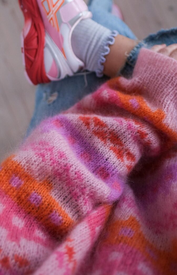 Strikkepakke med garn og gratis digital strikkeoppskrift. Purple rain – herlig fargerik 80talls genser. Strikkes i 2 tråder Hip Mohair, ovenfra og ned i nydelig mønster. Enkelt diagram som følges hele veien. Genser strikkes i 1 hovedfarge og 5 mønsterfarger.