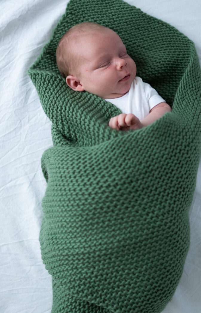 Strikkepakke med garn og gratis digital strikkeoppskrift. Superenkelt babyteppe i rillestrikk. Varmt og fint teppe til baby og små.