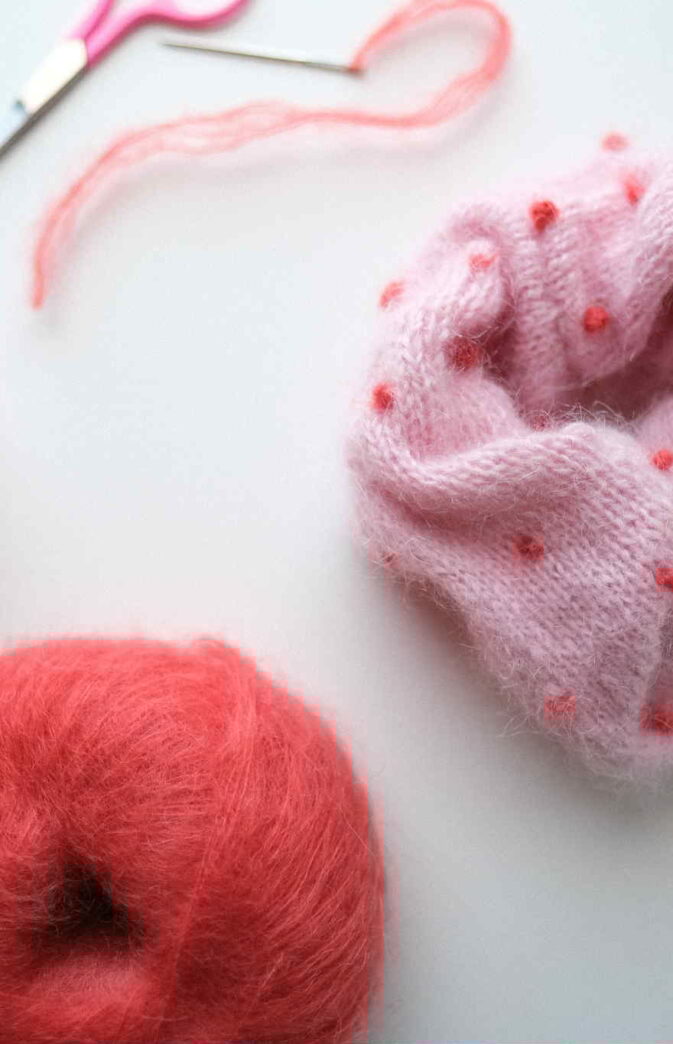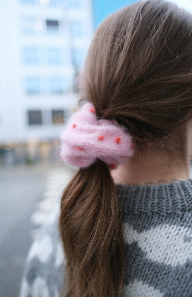 Strikkeoppskrift på scrunchie. The Dot Scrunchie –Søtt lite strikkeprosjekt i mohair (eller annet restegarn). Strikk det med striper, med «dot» i ulike farger – fin oppskrift som kan varieres i det uendelige. Den perfekte gave til en venn, de små eller til deg selv. Video for hvordan strikke de små prikkene finner du her: https://hipknitshop.no/strikkevideoer/