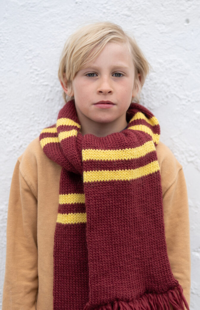 Strikkepakke med garn og gratis digital strikkeoppskrift. Det berømte Harry Potter skjerfet, i Gryffindor farger. Et langt mykt skjerf strikket rundt i glattstrikk. Perfekt for nybegynnere. Lag det med frynser eller uten for et enklere uttrykk. Velg gjerne farger fra ditt favoritthus på Galtvort.