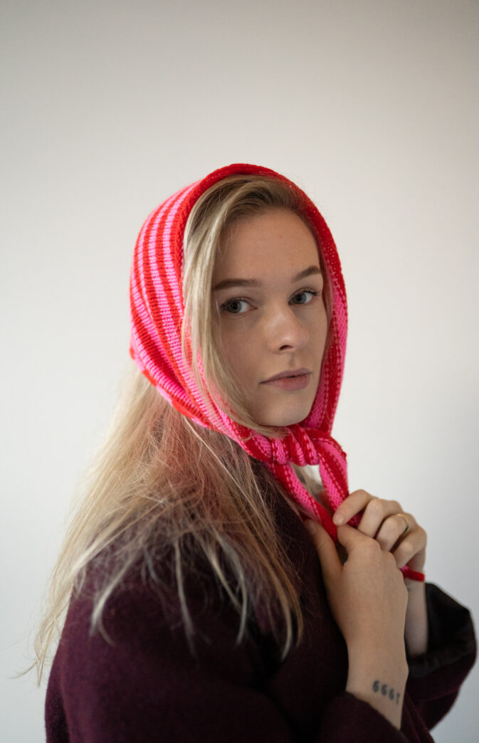 Avbildet i Pop merino lite striper "Juicy Red" og "Pink Crush" og "stort "Foggy grey"
