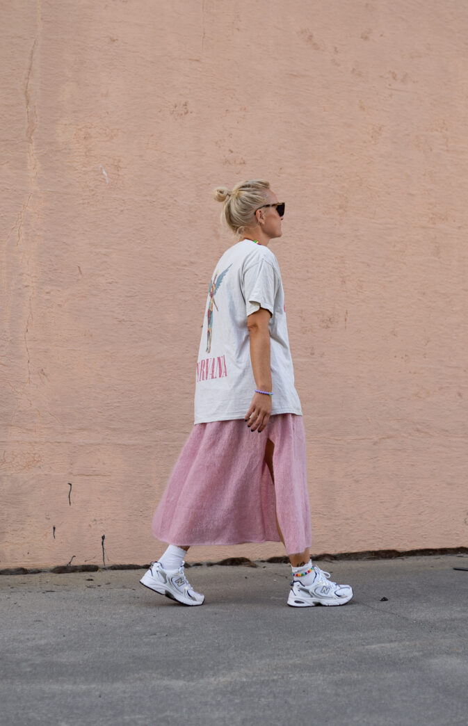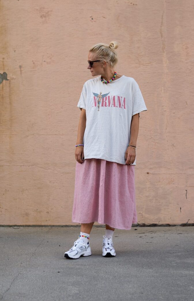 Passform – Skjørtet er veldig elastisk/ tøyelig med strikk, gå heller ned enn opp i størrelse om du er usikker. Livvidde bør være mindre enn cm mål på deg for en pen passform. Modell avbildet har en «negativ ease» på ca 8 cm (det vil si at modell er 8 cm mer i vidde enn mål oppgitt her (uten strikk). Om du velger en større størrelse vil få mer «ballerina» skjørt effekt (mer «tyll»).