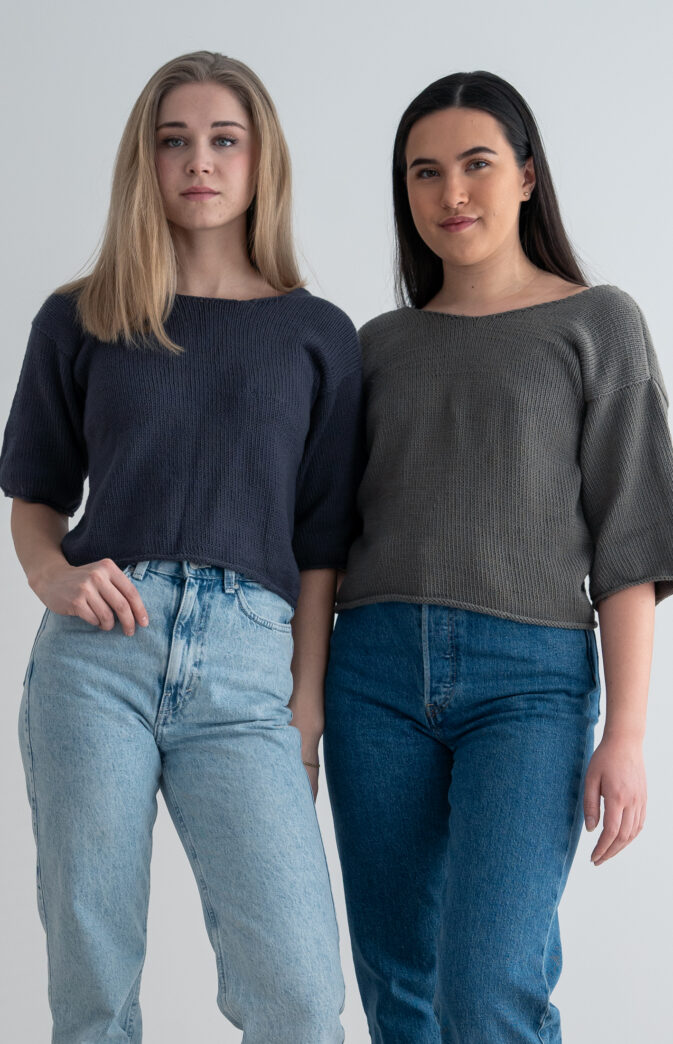 Avbildet i Cuddle Me Cotton med rund hals i «Deep Sea», str S og “Rainforest” med V hals i str M
