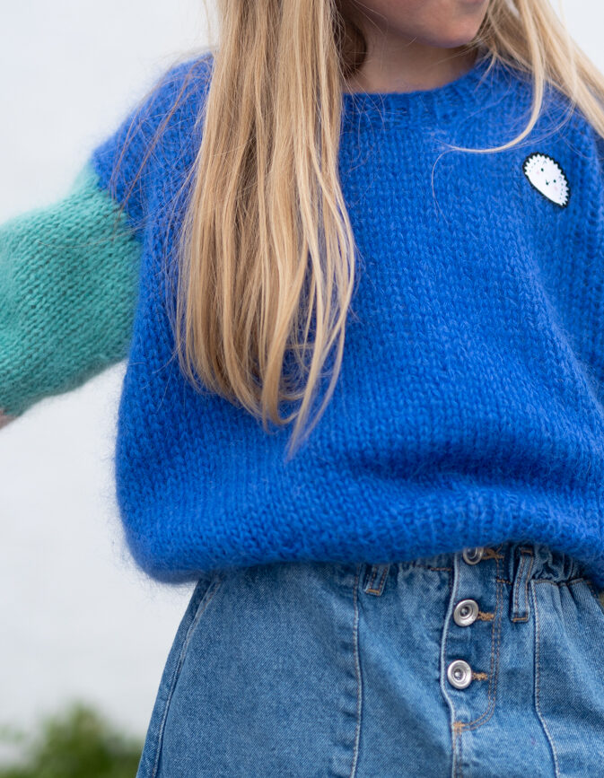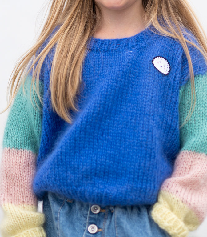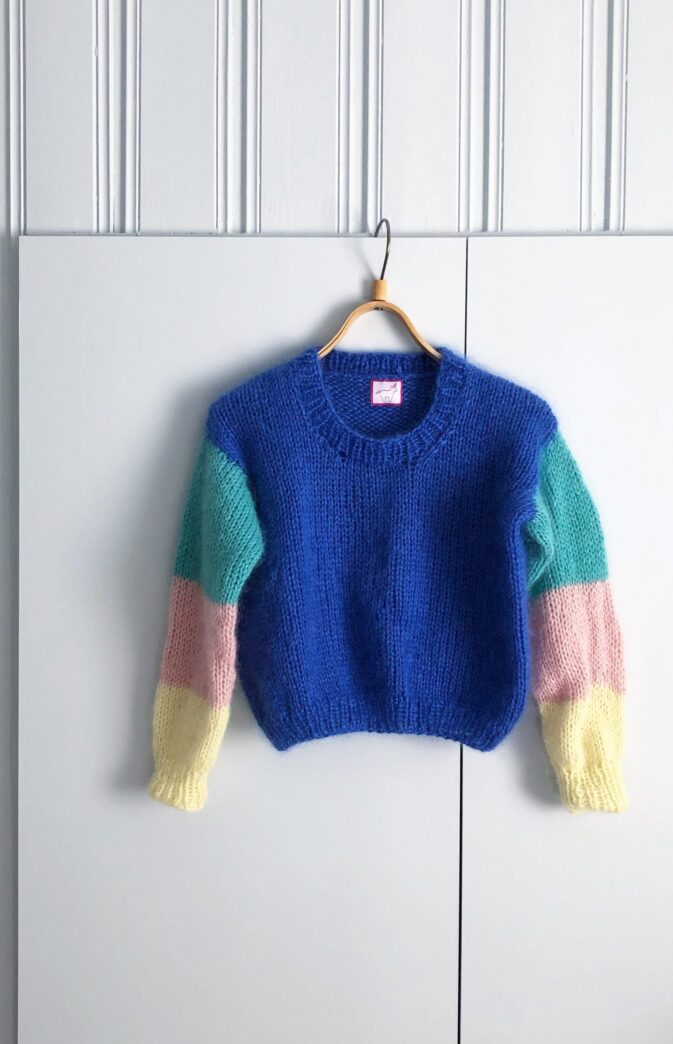 Vi elsker 80-tallet! Morsom og enkel strikkegenser som barna elsker. Lag den litt ekstra personlig med et strykemerke og enhjørnings merkelapp.