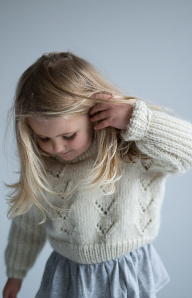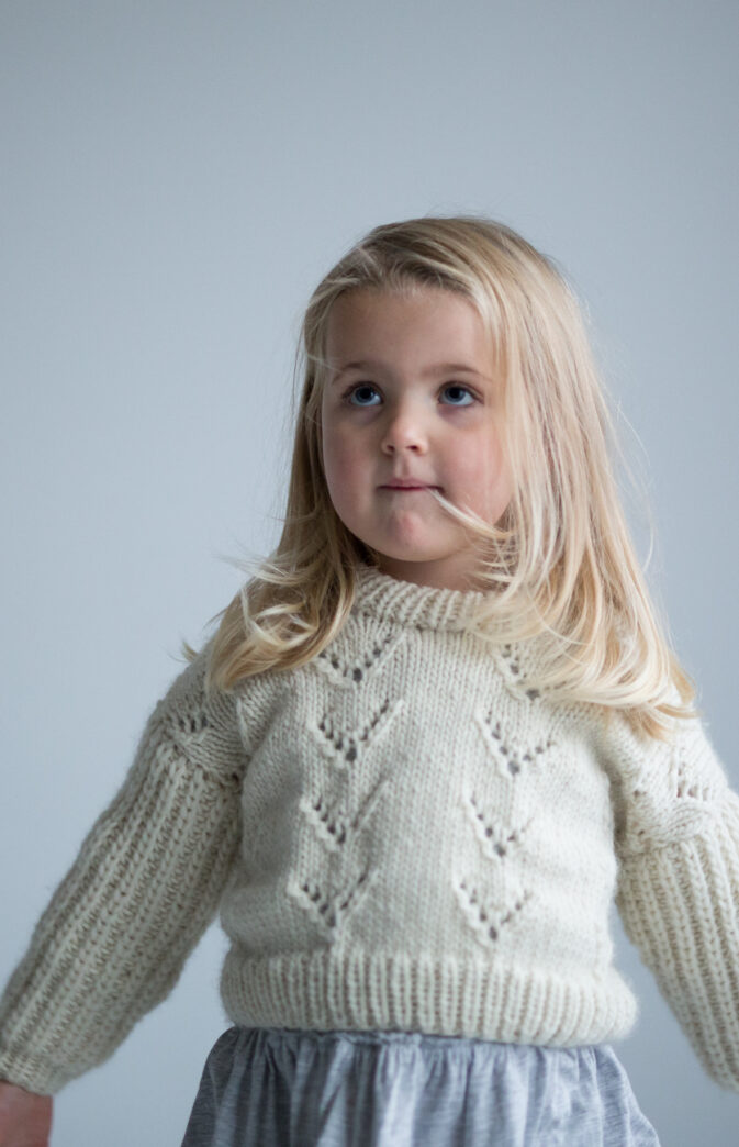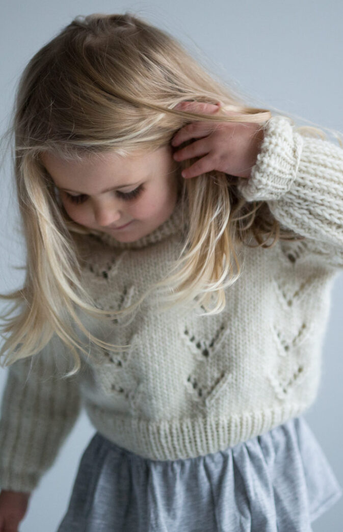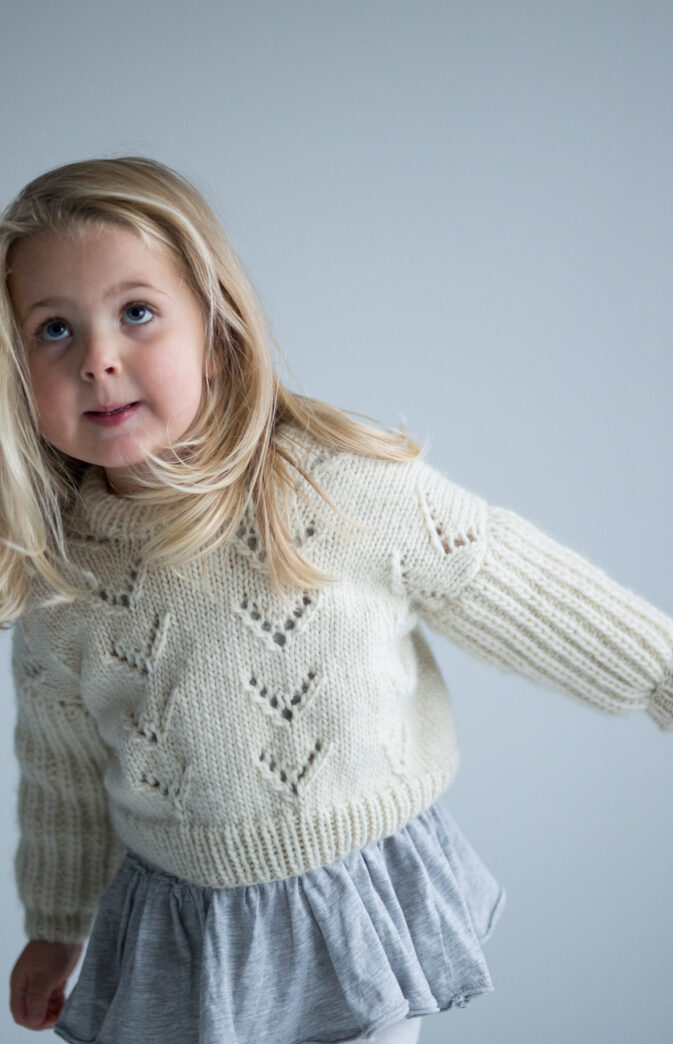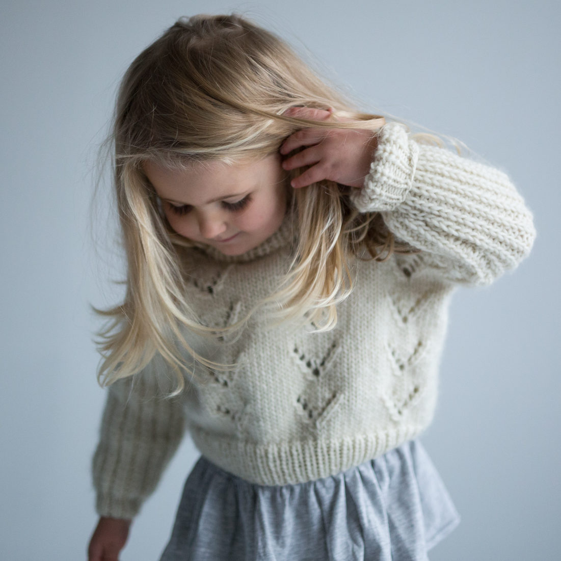 Strikkepakke med garn og gratis digital strikkeoppskrift. Nydelige Bloom genser til barn. En varm og lett genser med en enkelt hullmønster fremme på bol. Kort og bred fasong, perfekt til kjoler og skjørt. Hullmønster på bol, halvpatent strikk på ermene.