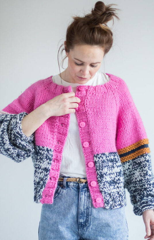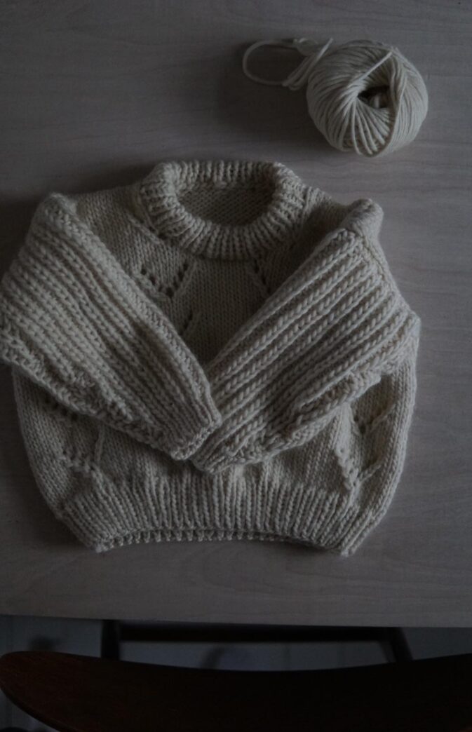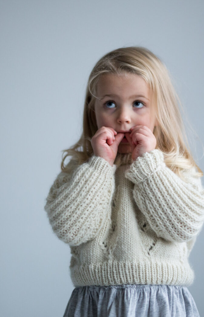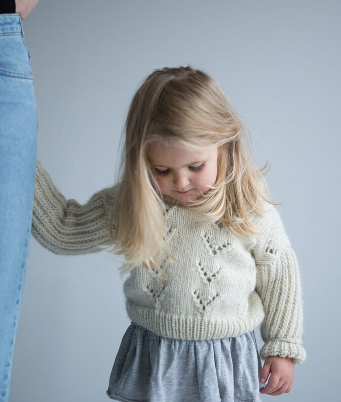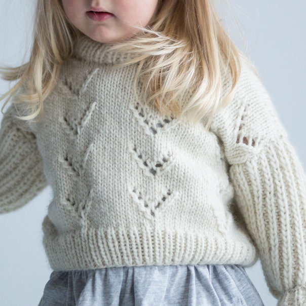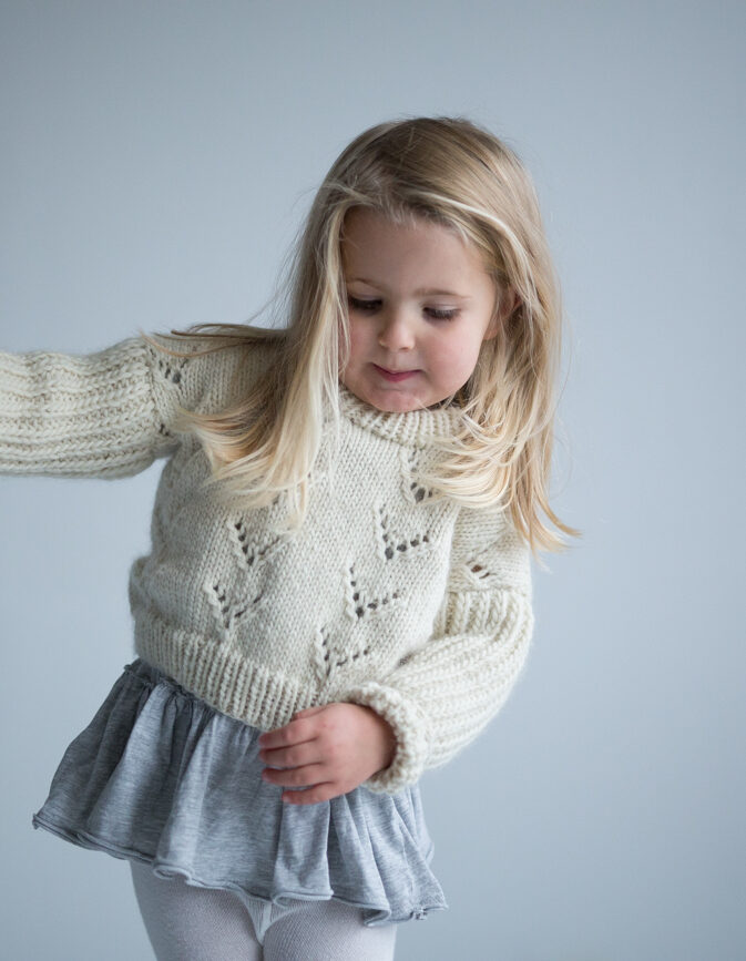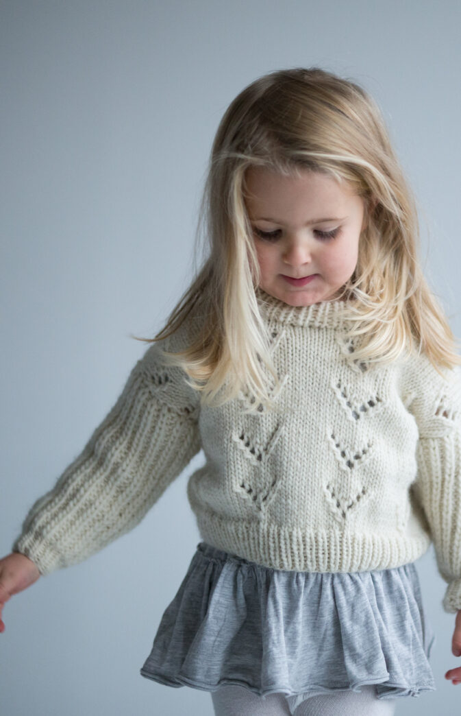 Strikkepakke med garn og gratis digital strikkeoppskrift. Nydelige Bloom genser til barn. En varm og lett genser med en enkelt hullmønster fremme på bol. Kort og bred fasong, perfekt til kjoler og skjørt. Hullmønster på bol, halvpatent strikk på ermene.
