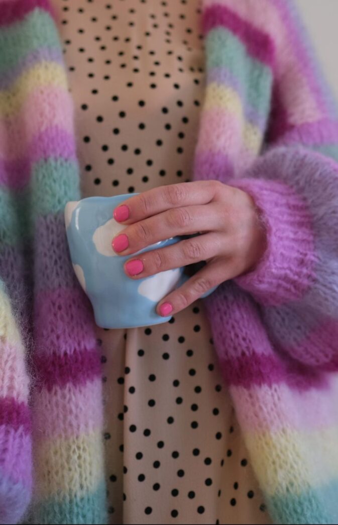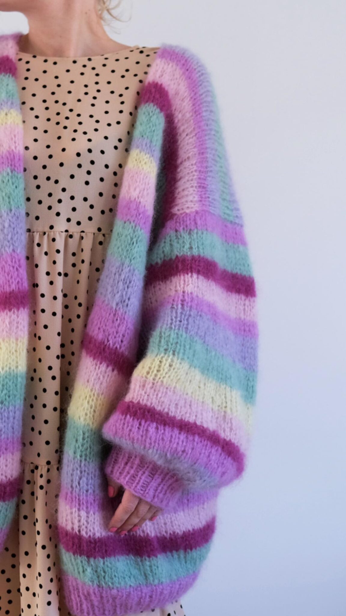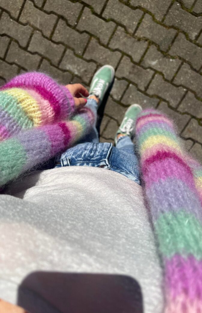 Strikkepakke med garn og gratis digital strikkeoppskrift. Stripejakke i mohair. Paradisjakken med striper- en deilig stor, fluffy og skikkelig kosete jakke. Enkel strikkeoppskrift for strikkejakke med striper.