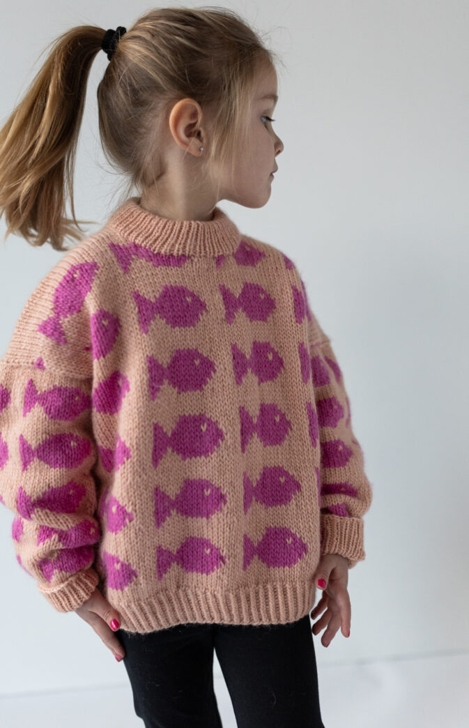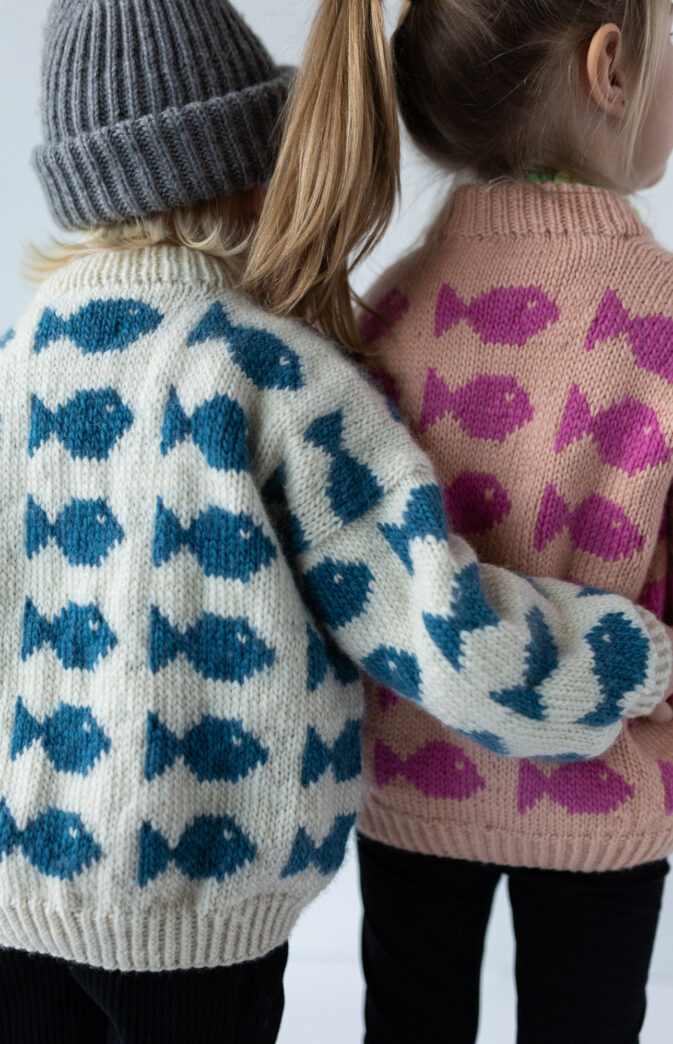 Avbildet i «Coconut White» med fisker i «Blue waves». Lys fersken og rosa genser i «Just Peachy» og «Flamingo fever» (str 6 år på barn snart 5 år, sammen med POP lue)
