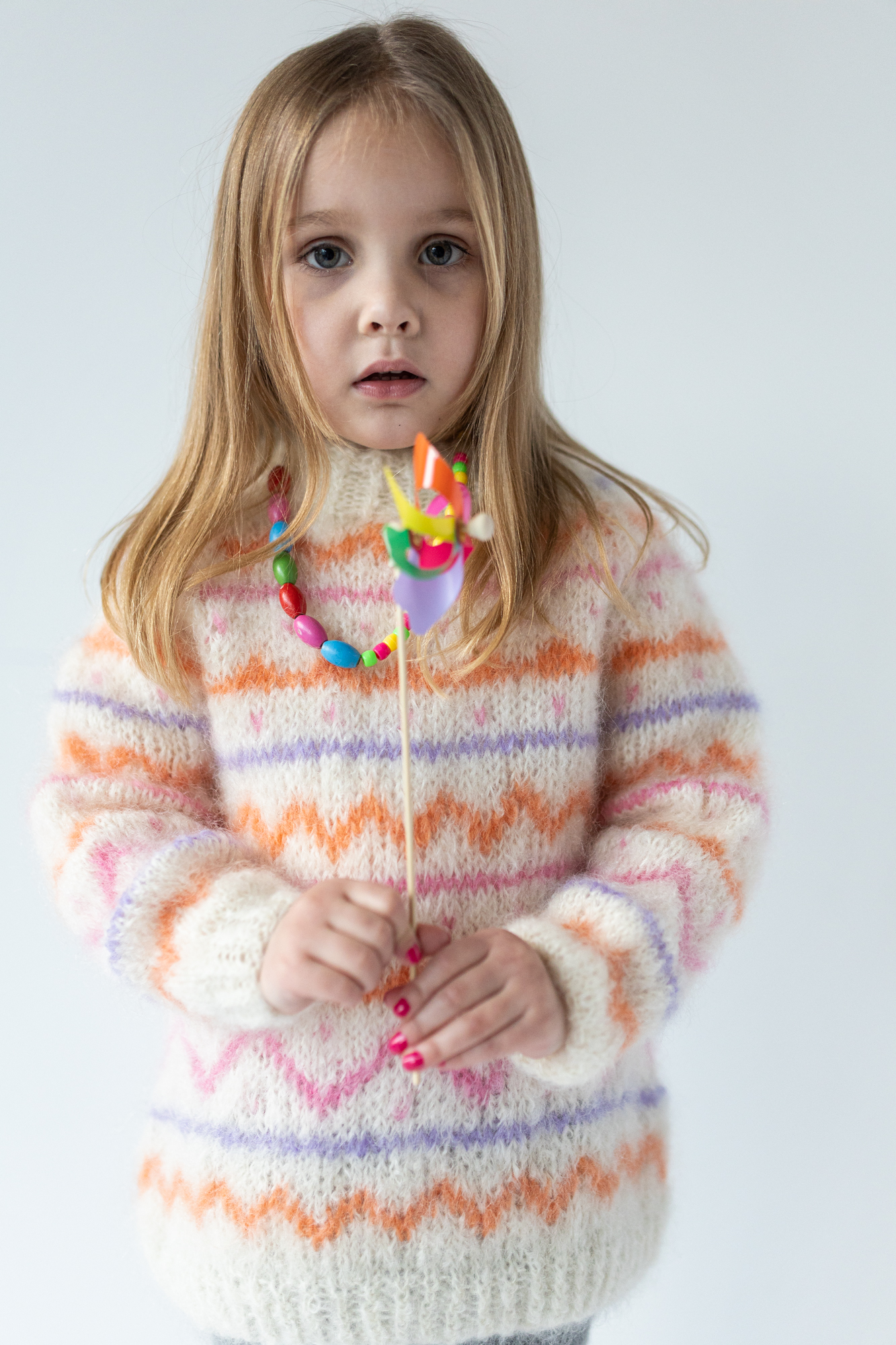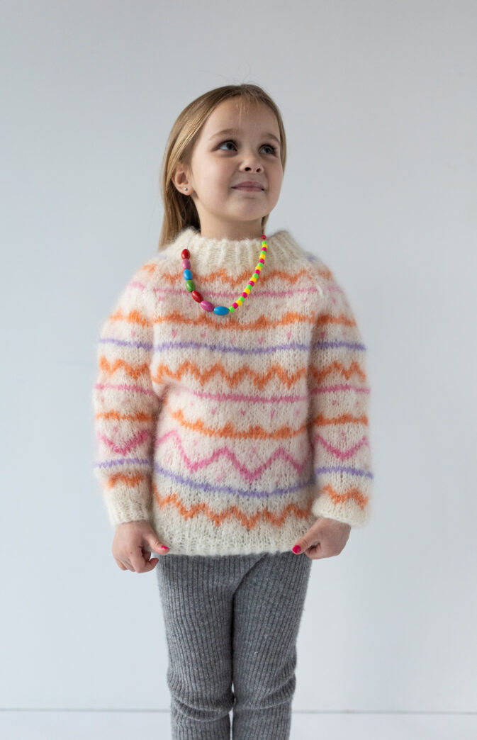 Strikkepakke med garn og gratis digital strikkeoppskrift. Tivoli genseren – genser med enkel mønsterrapport som er gøy å strikke! Her kan du leke deg med ulike farger for å skape en helt unik genser og uttrykk. Tivoli serien kommer også til dame og herre samt som slipover. Genseren strikkes nedenfra og opp med mønster som repeteres oppover bol. Ermer strikkes for seg, og settes så sammen med bol og det strikkes raglanfelling.