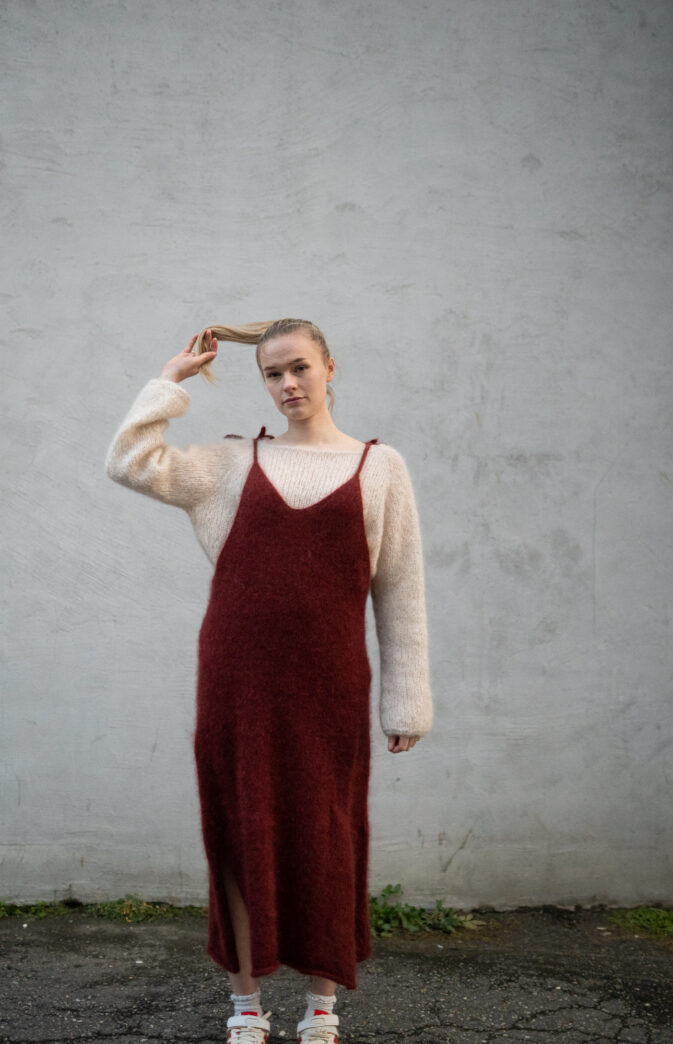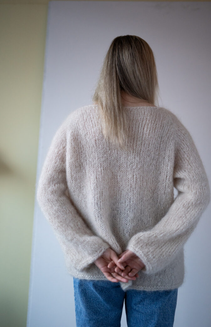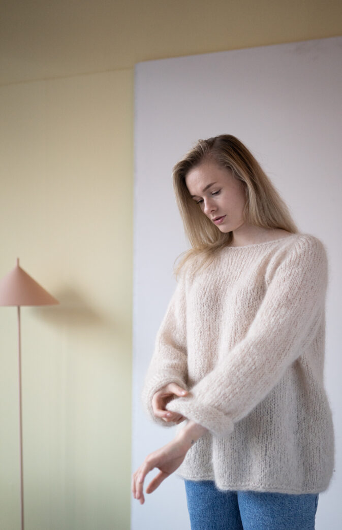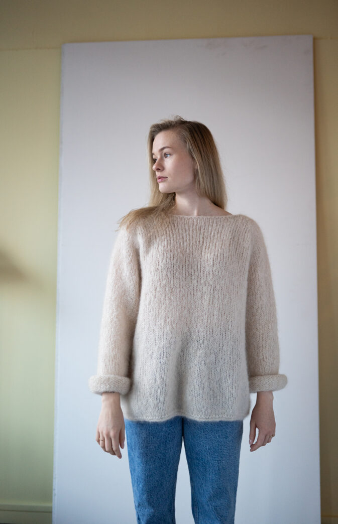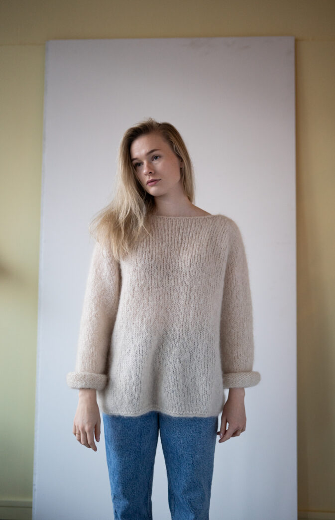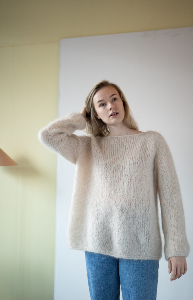 Genseren kan strikkes med 4 tråder Hip Mohair (2 nøster- begge ender, eller nøst opp 1 i 4 små) for samme strikkefasthet som Fluff. Fargevalg og kombinasjoner er derfor uendelige og perfekt til å leke seg med striper og farger.