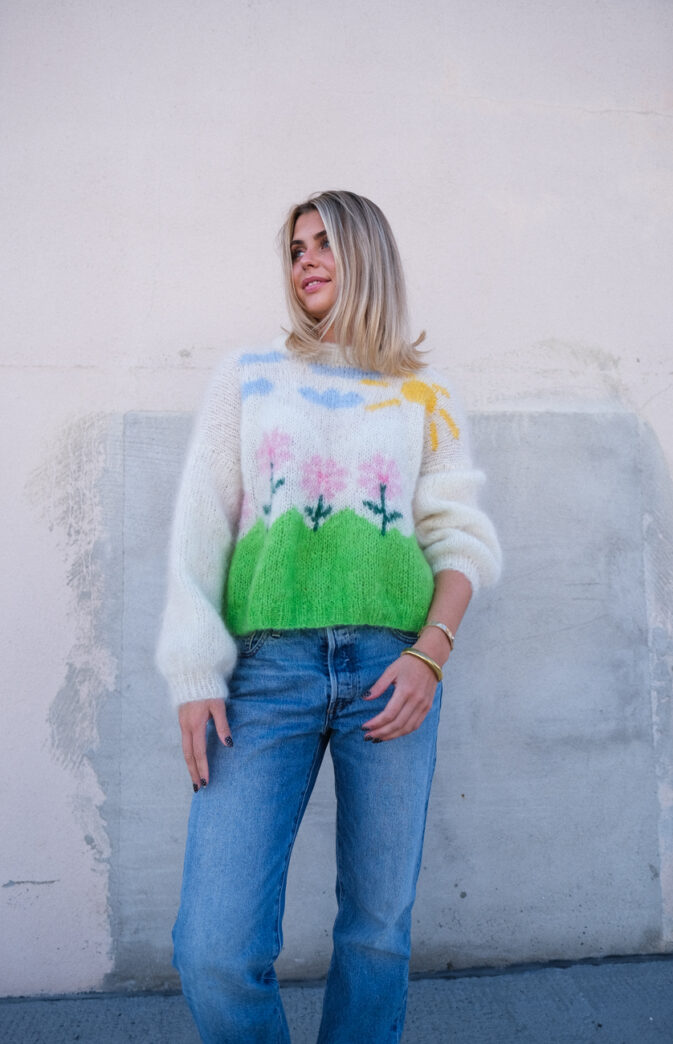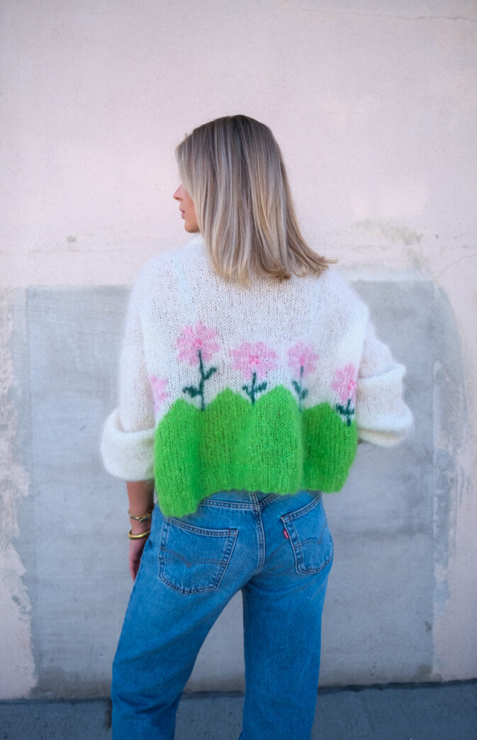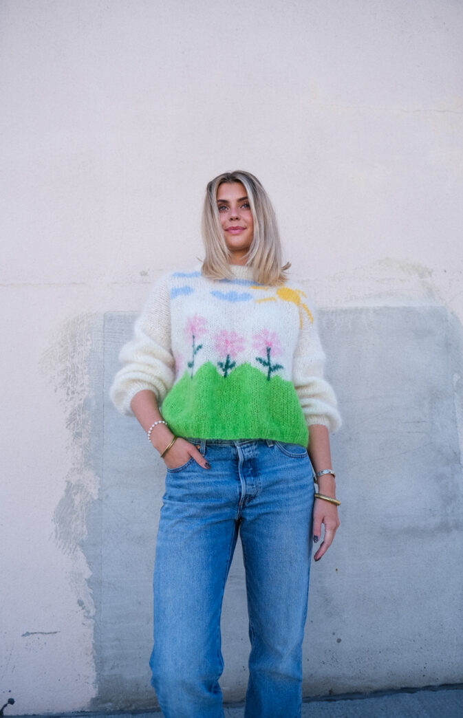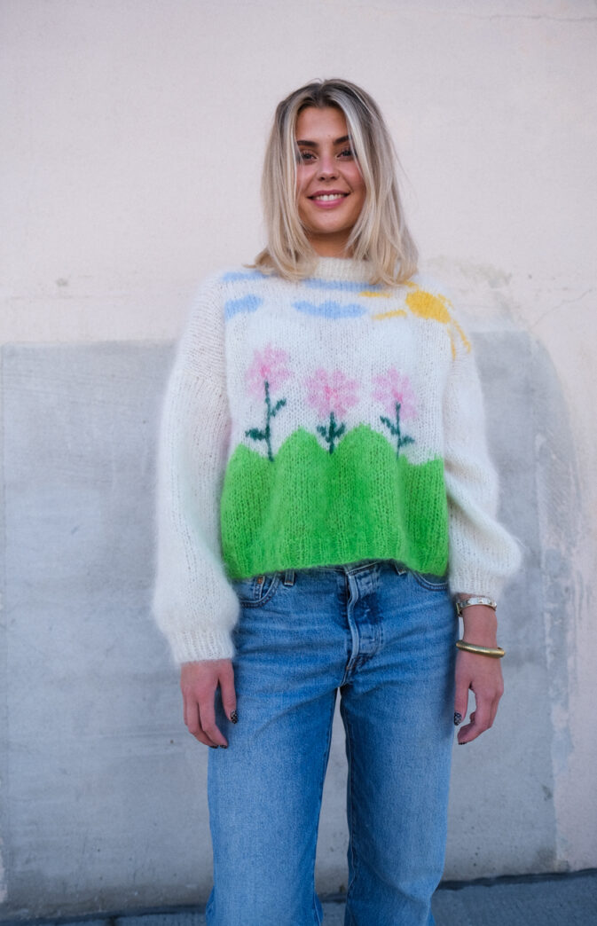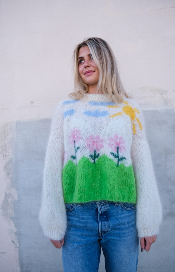 Strikkepakke med garn og gratis digital strikkeoppskrift. Det var en gang en nydelig genser som forteller om vår- og sommereventyr. Med gress, blomster, sky og sol. Perfekt å ta med seg inn i høsten og mørketid. Diagram strikkes med intersia teknikk for best mulig resultat. For-og bakstykket strikkes hver for seg, nedenfra og opp, frem og tilbake. Strikkes sammen i sidene i ettertid. Ermer strikkes ovenfra og ned. Bruk gjerne restegarn til små detaljer. Genseren kan brukes begge veier. Avbildet her i M-L.