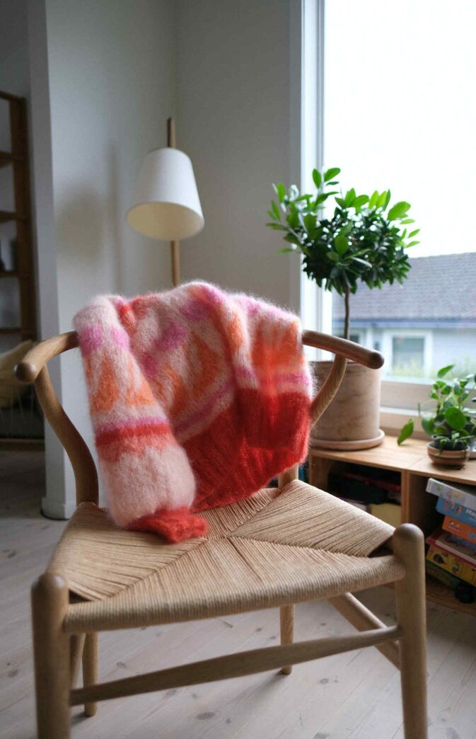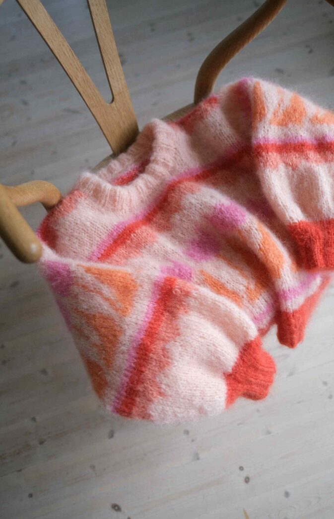 Genser er vid i ermer og bol, normal lengde, tykk ribb i hals. Strikkes nedenfra og opp i 5 farger. Ermer strikkes ovenfra og ned. Kan strikkes uten montering.