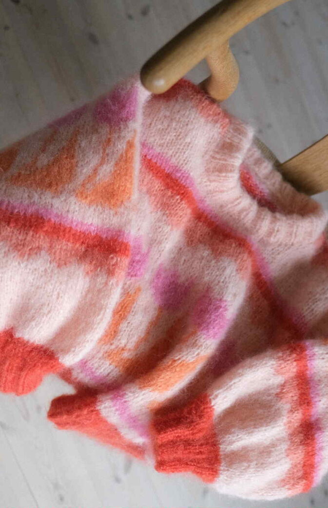 Avbildet er genser i str M, Farge 1, Lipstick red, Vanilla Flavour, Peachy papaya, Baby Pink og Strawberry cream