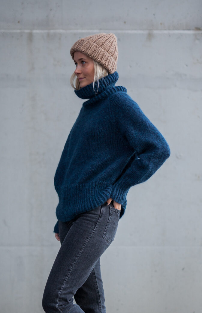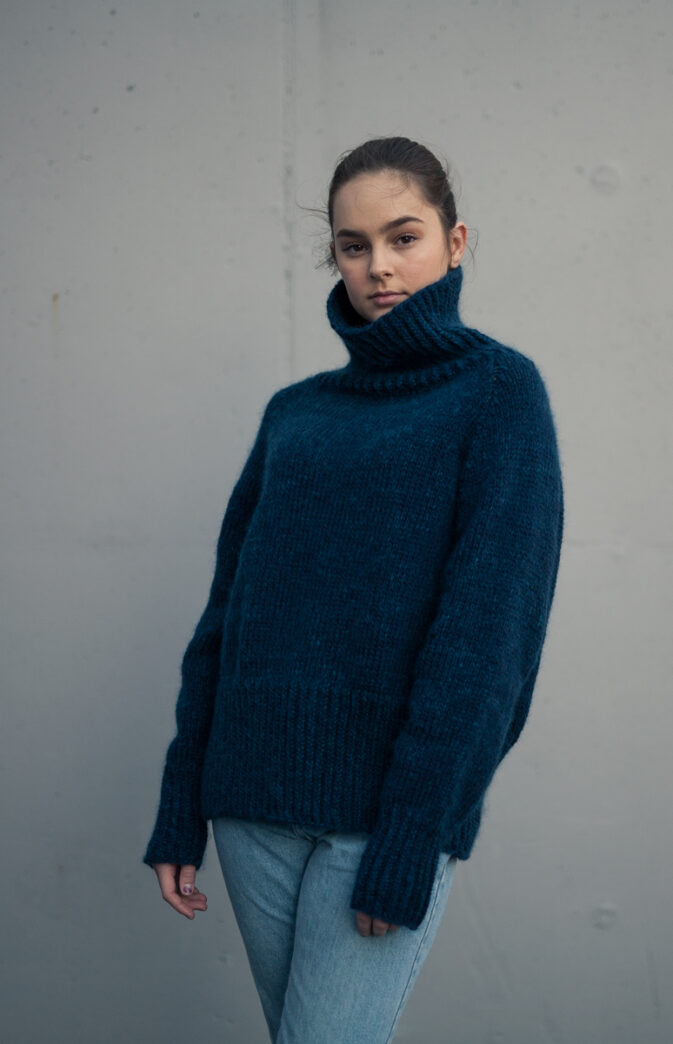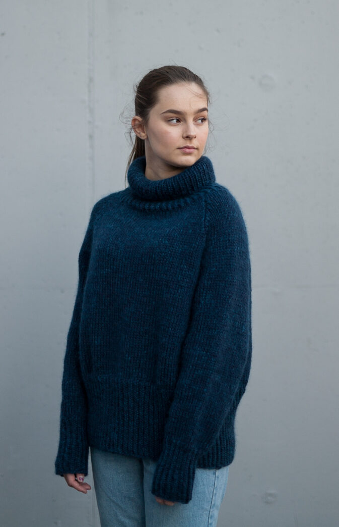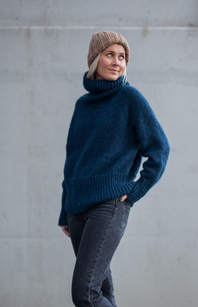 Avbildet i Hip Wool "Midnight Mood blå" og Hip Mohair "Petrol blå" (Modellen 172 cm høy, i str M)