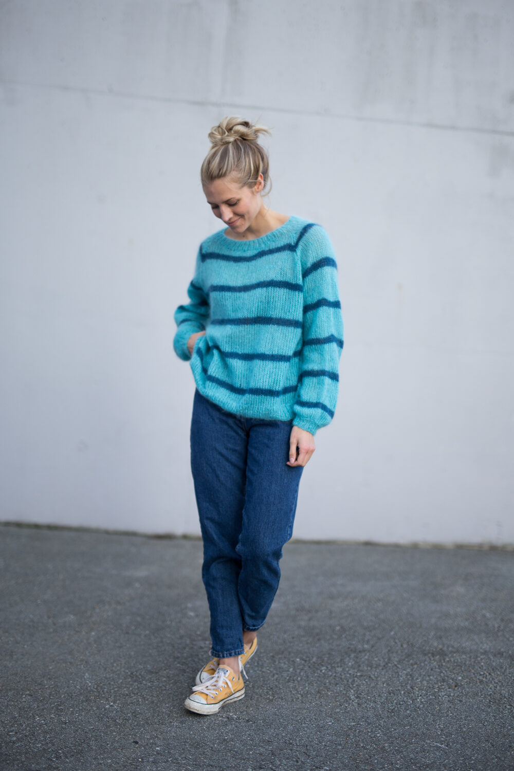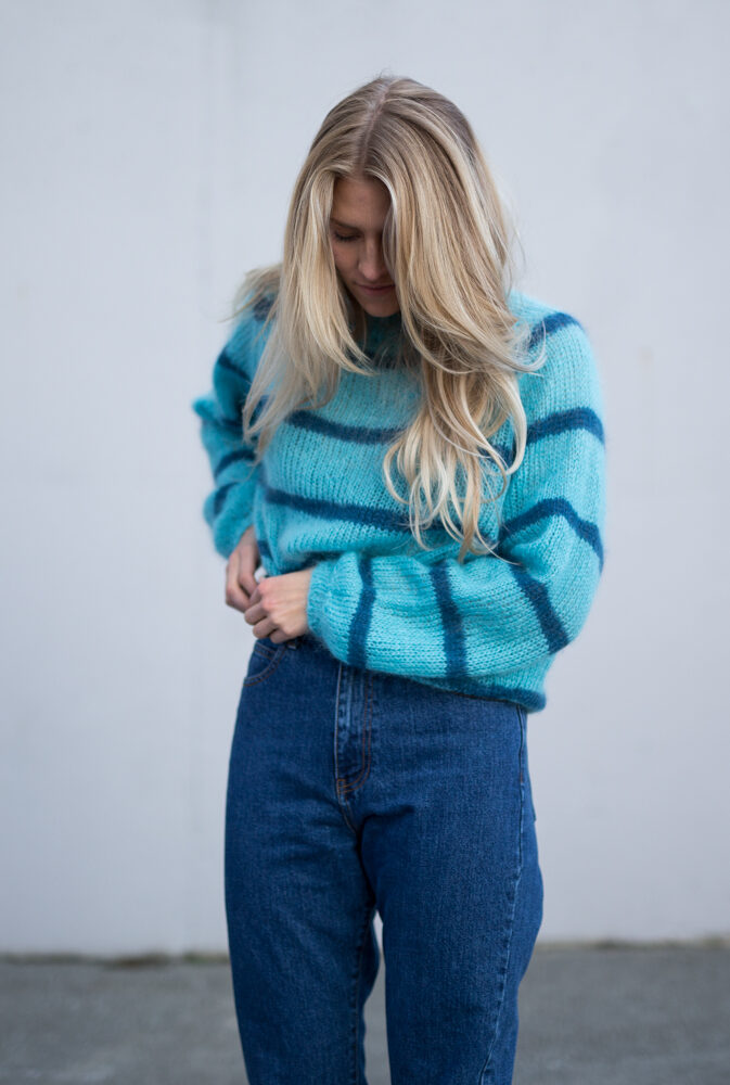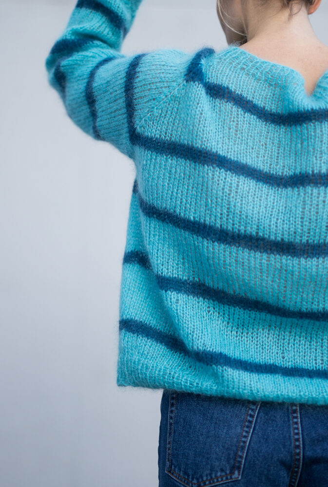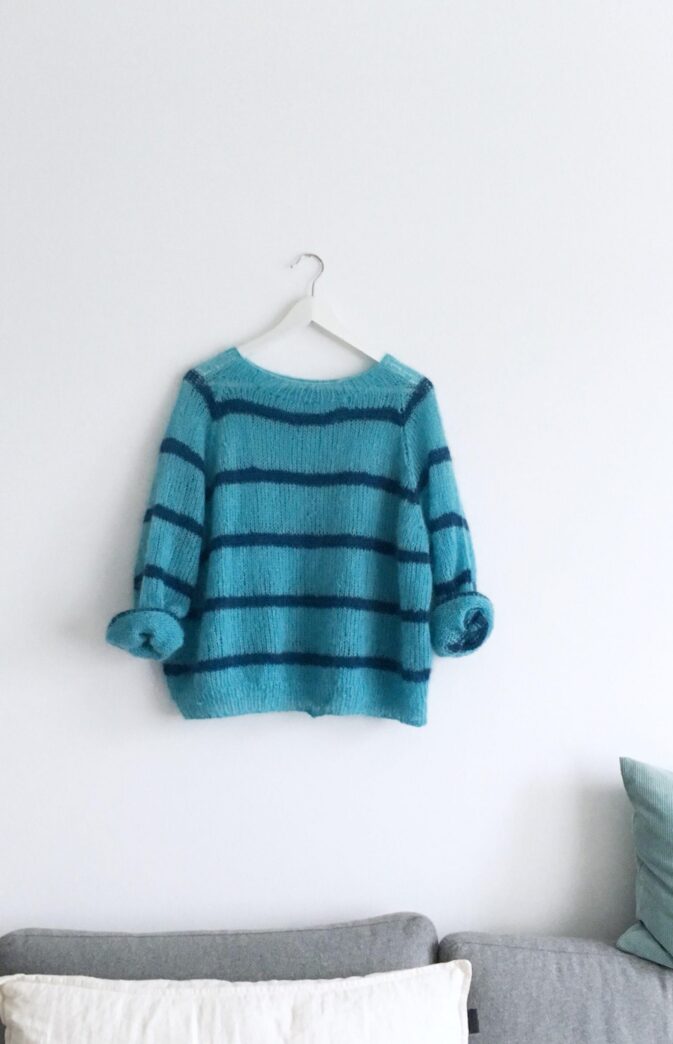 Vår første strikkeoppskrift er ennå med oss. Enkel genser perfekt for nybegnnere. Strikkes nedenfra og opp i dobbel tråd Hip Mohair, raglanfelling. Klassisk stripete genser.