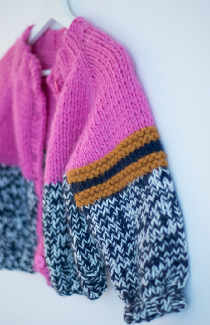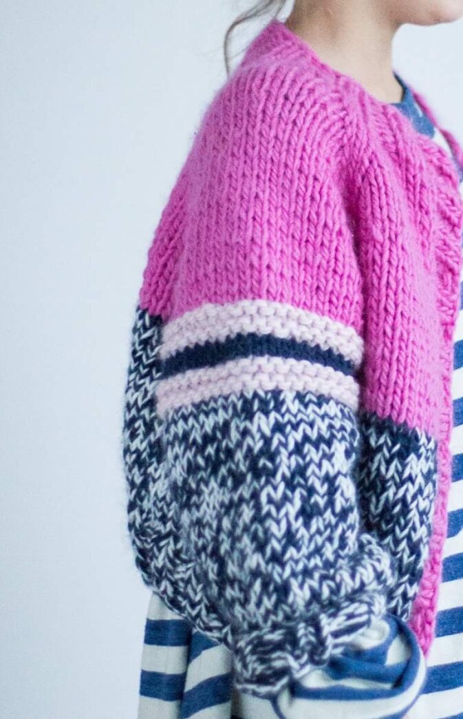 Strikkepakke med garn og gratis digital strikkeoppskrift. Fargerik jakke til jente (og gutt). Strikkes ovenfra og ned med dobbel tråd Hip Wool.