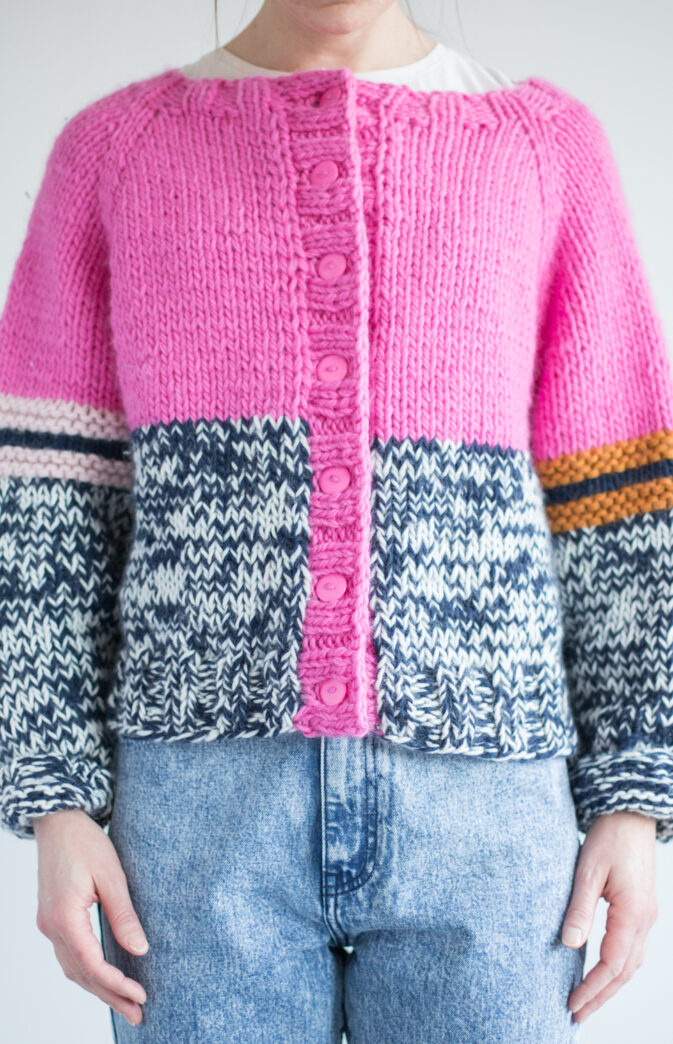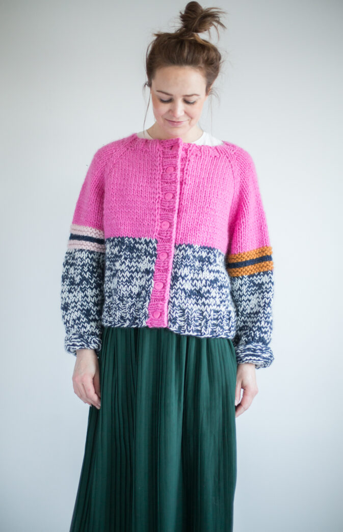 Kul og fargerik strikkejakke til dame. Strikkes ovenfra og ned i dobbel tråd Hip Wool. Raglanøkning. Lek deg gjerne med farger og kombinasjoner.