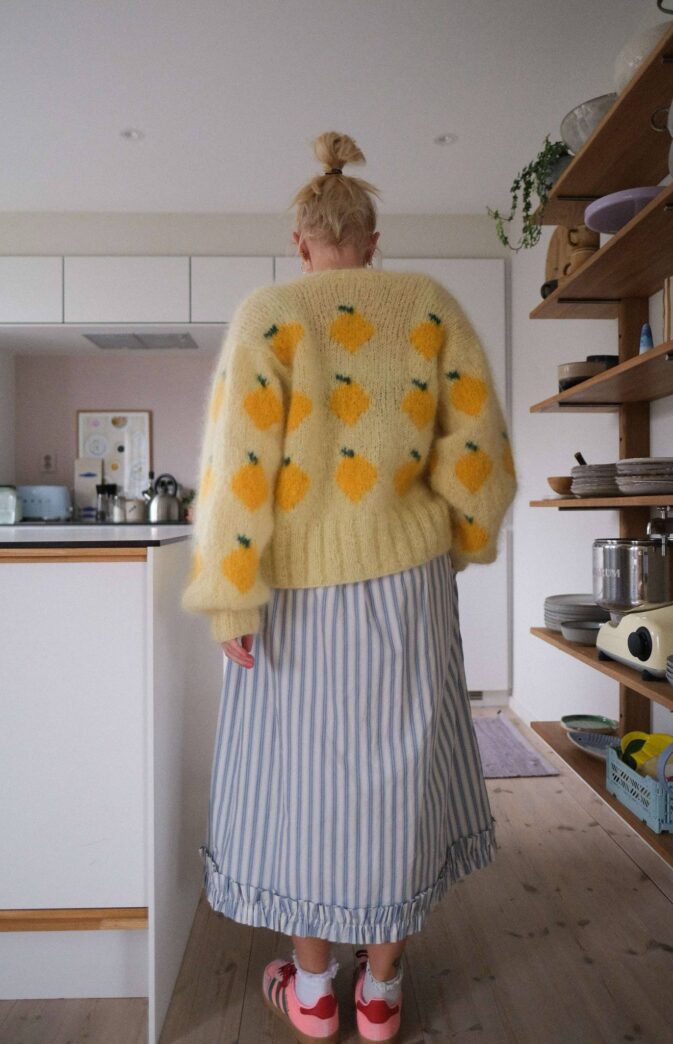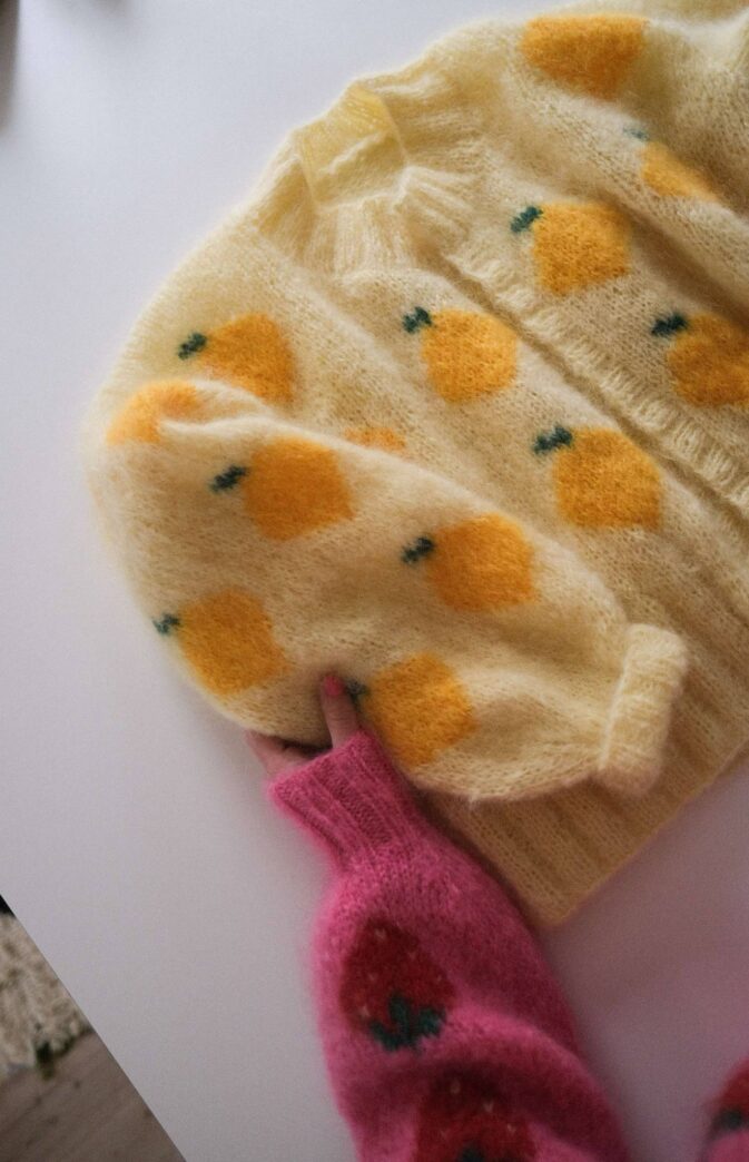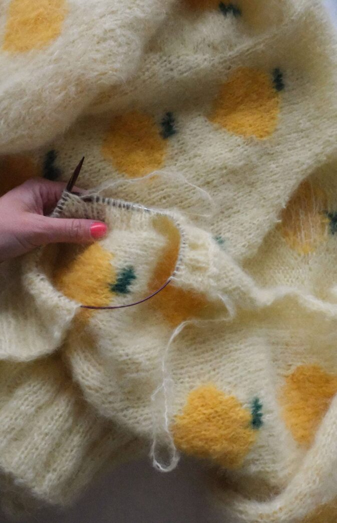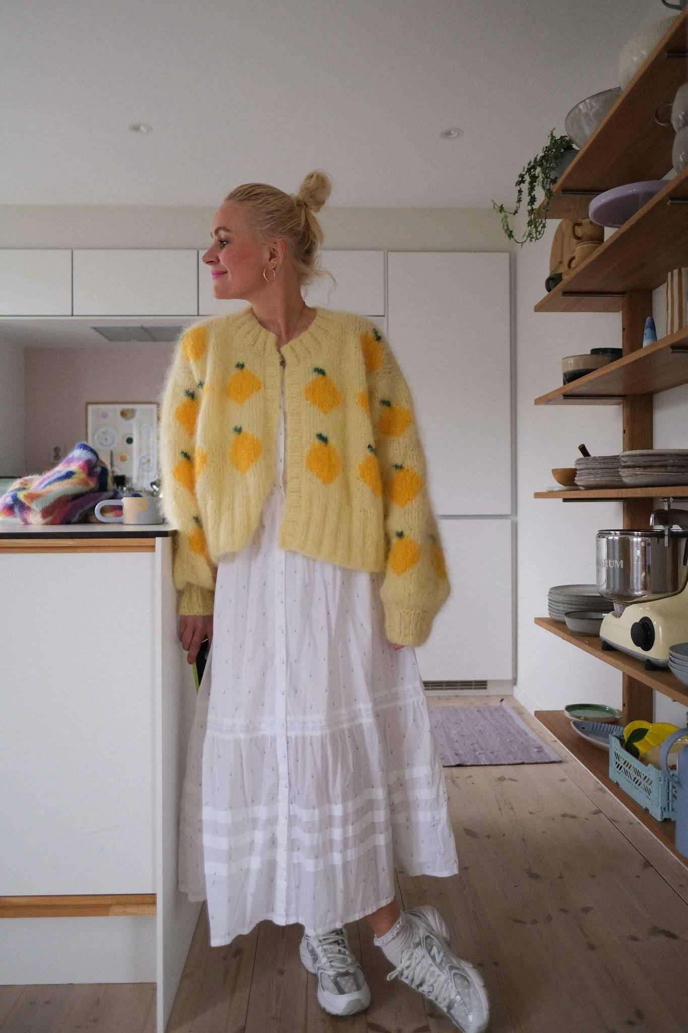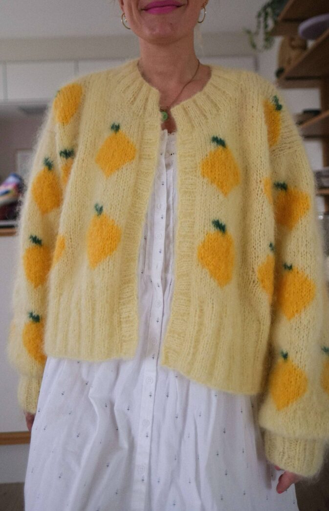 Oppskriften er laget og tilpasset Fluff Mohair garn fra HipKnitShop. Avbildet i Sitron jakke i «Lemonade» med stilk «Pine Forest» og sitroner i «little Miss Sunshine i str L-XL.