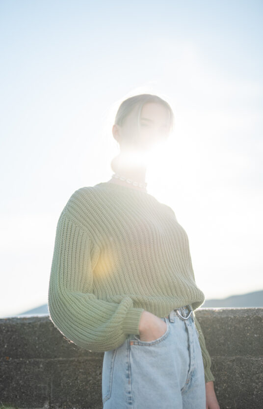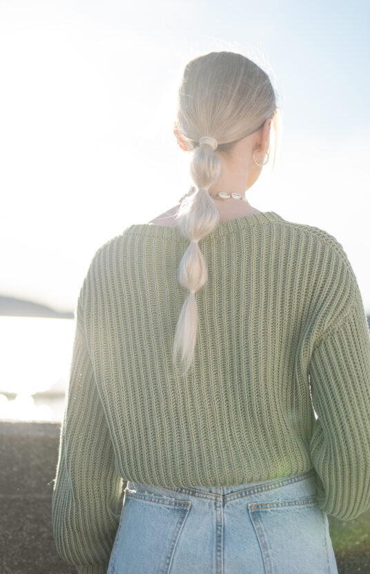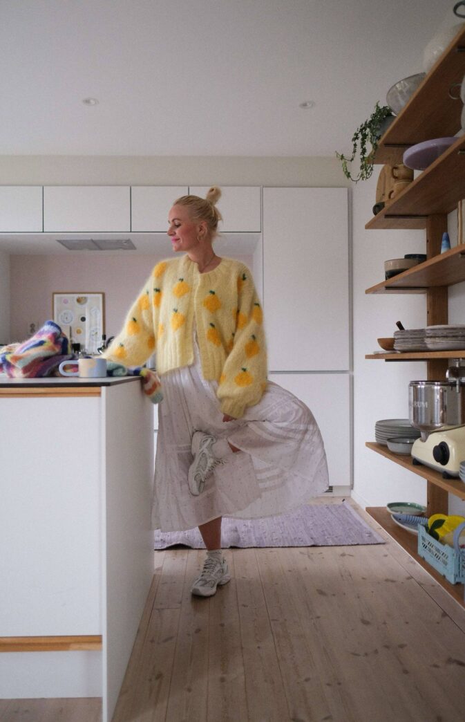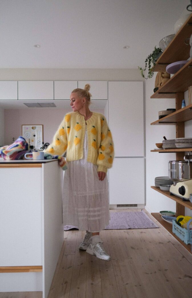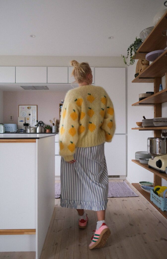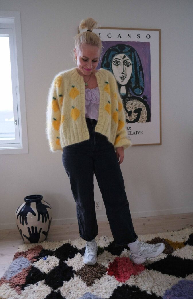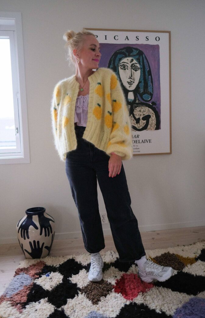 Oppskriften er laget og tilpasset Fluff Mohair garn fra HipKnitShop. Avbildet i Sitron jakke i «Lemonade» med stilk «Pine Forest» og sitroner i «little Miss Sunshine i str L-XL.