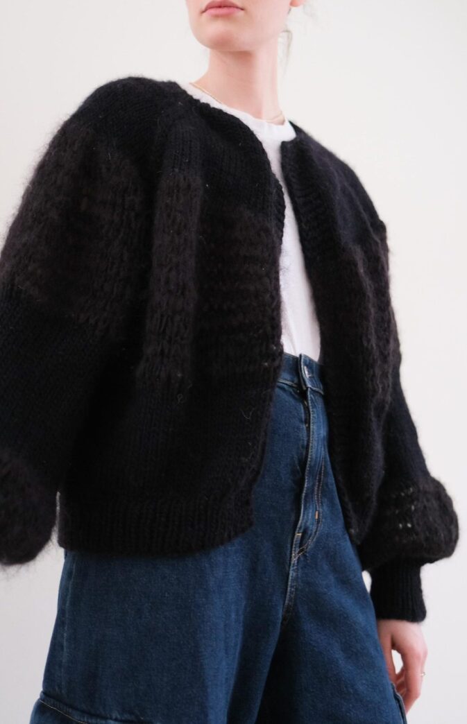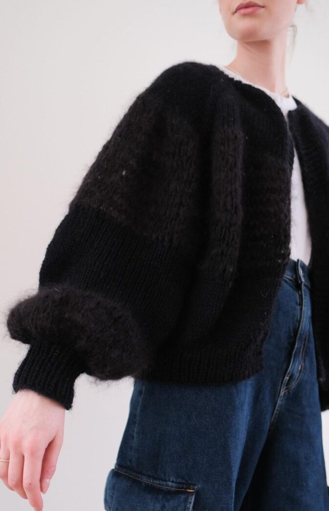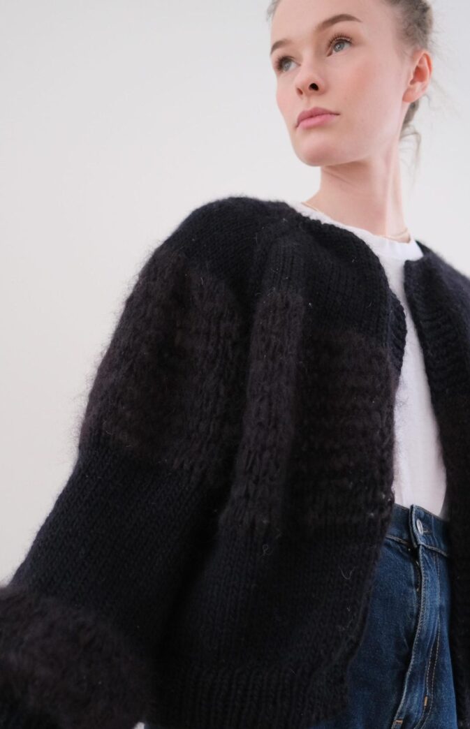Avbildet i farge "Licorice Love" Hip Wool sammen med "Black is back" Fluff mohair. Fargerik versjon i "On fire Orange" Hip Wool farge 1, "Flamingo Fever" Hip Wool farge 2 og "Lilac Breeze" Fluff mohair. Grønn jakke "Iceberg" Hip Wool med "Forest green" Fluff