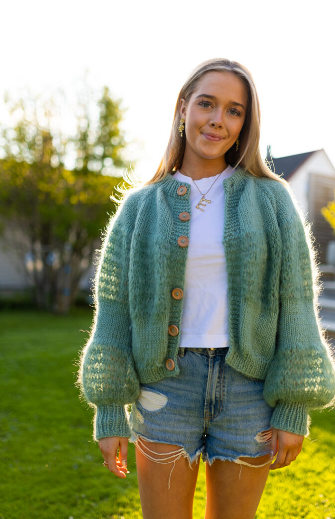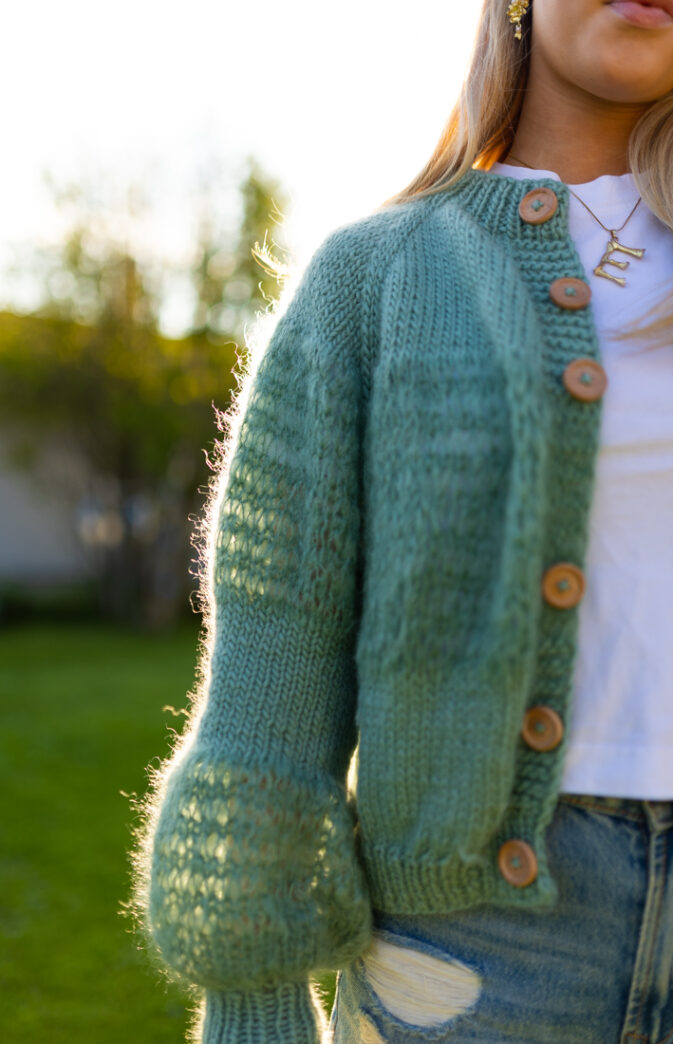 Strikkepakke med garn og gratis digital strikkeoppskrift. Strikkejakke til dame i Fluff og Hip Wool. Strikket ovenfra og ned med raglanøkning. Midtparti er strikket i Fluff med et «hullmønster» for en litt gøy og annerledes effekt. Vid og noe kort fasong, vide ermer. Knappestolpe strikkes underveis.