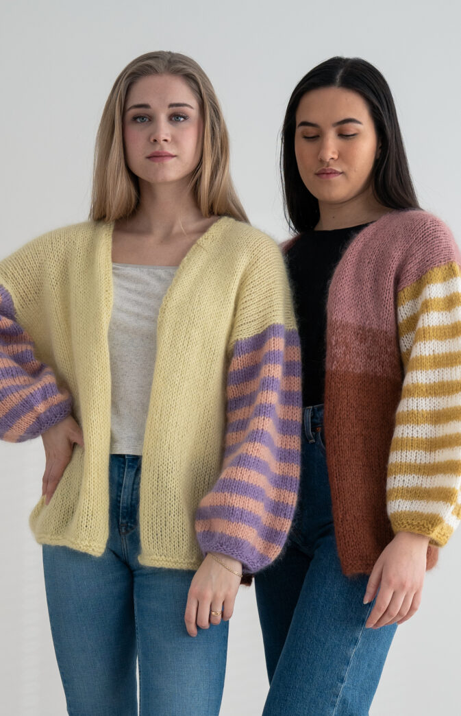Gul versjon: Hovedfarge "Lemonade", striper på erme "Just peachy" og "Perfect purple "Hip Mohair