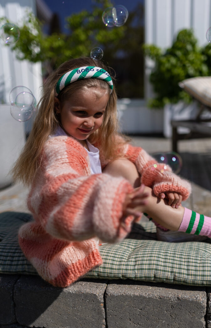 Velg størrelse etter mål overvidde og tilpass lengde ermer og bol etter barnet. Obs – korrekte mål forutsetter at strikkefasthet overholdes.