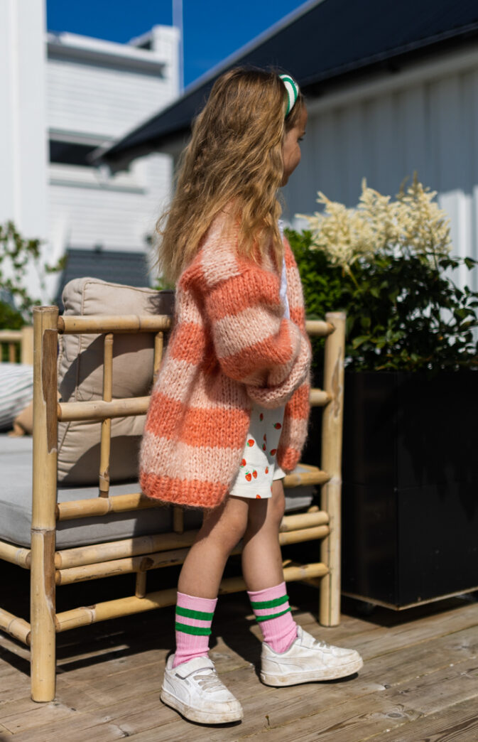 Strikkepakke med garn og gratis digital strikkeoppskrift. Digg varm sleng-på jakke til barna i dobbel tråd Fluff Mohair. Strikkes ovenfra og ned – du starter med å legge opp masker på bakstykket som strikkes frem og tilbake til ermeåpning er ferdig. Venstre- og høyre forstykke strikkes fra oppleggskant bakstykket. For- og bakstykket strikkes sammen til et stykke når ermeåpning er ferdig og videre til ønsket lengde. Ermer strikkes ovenfra og ned.
