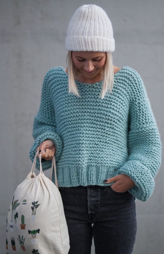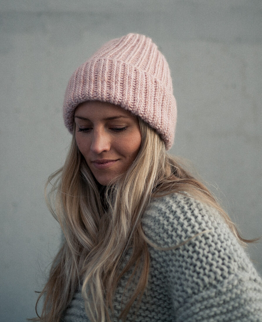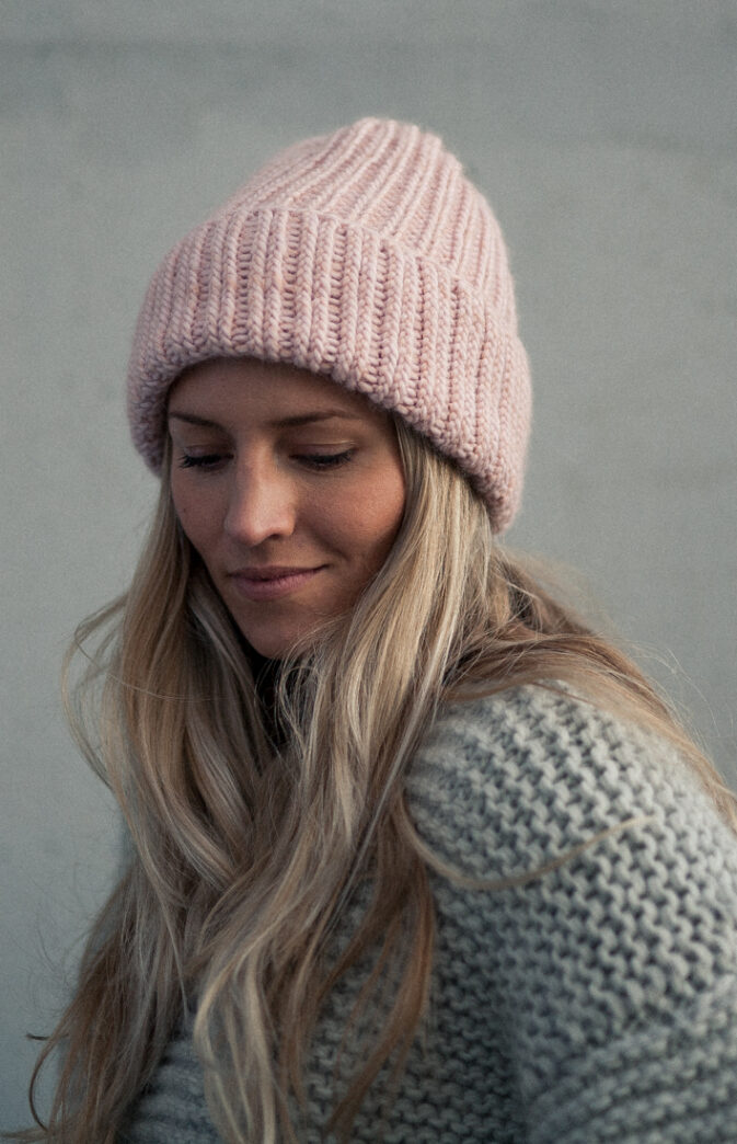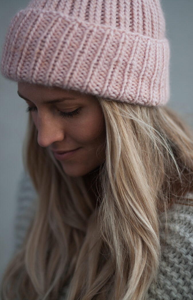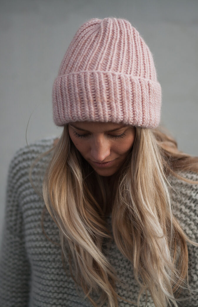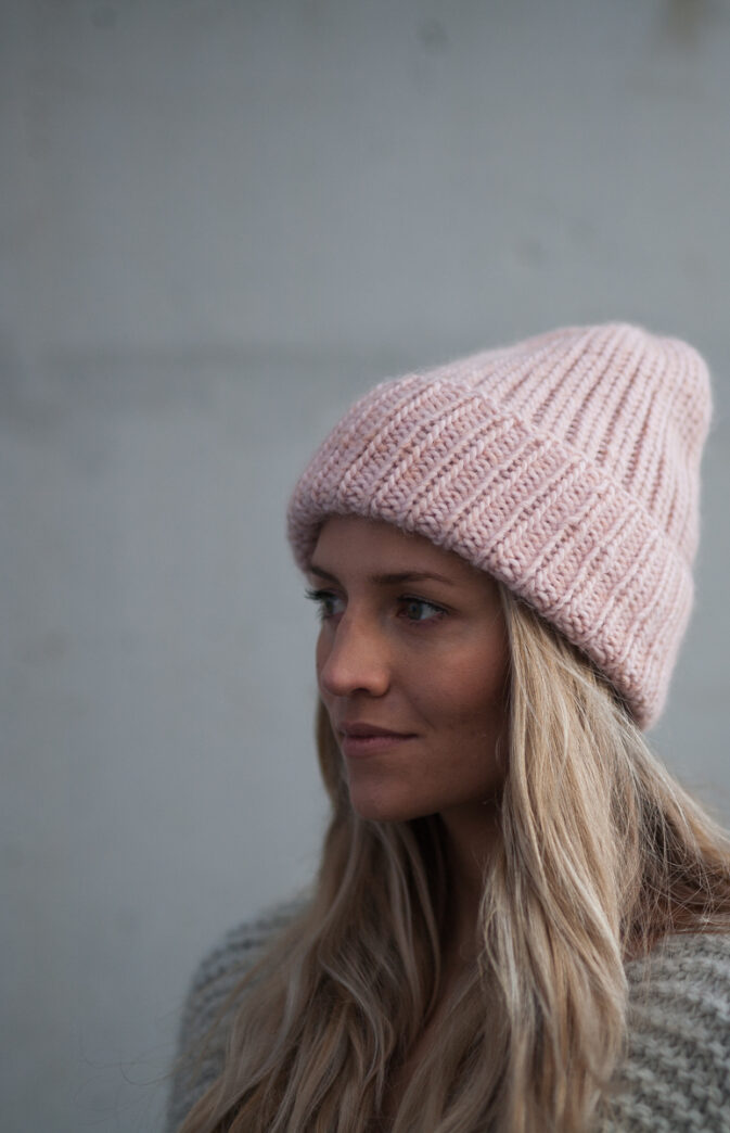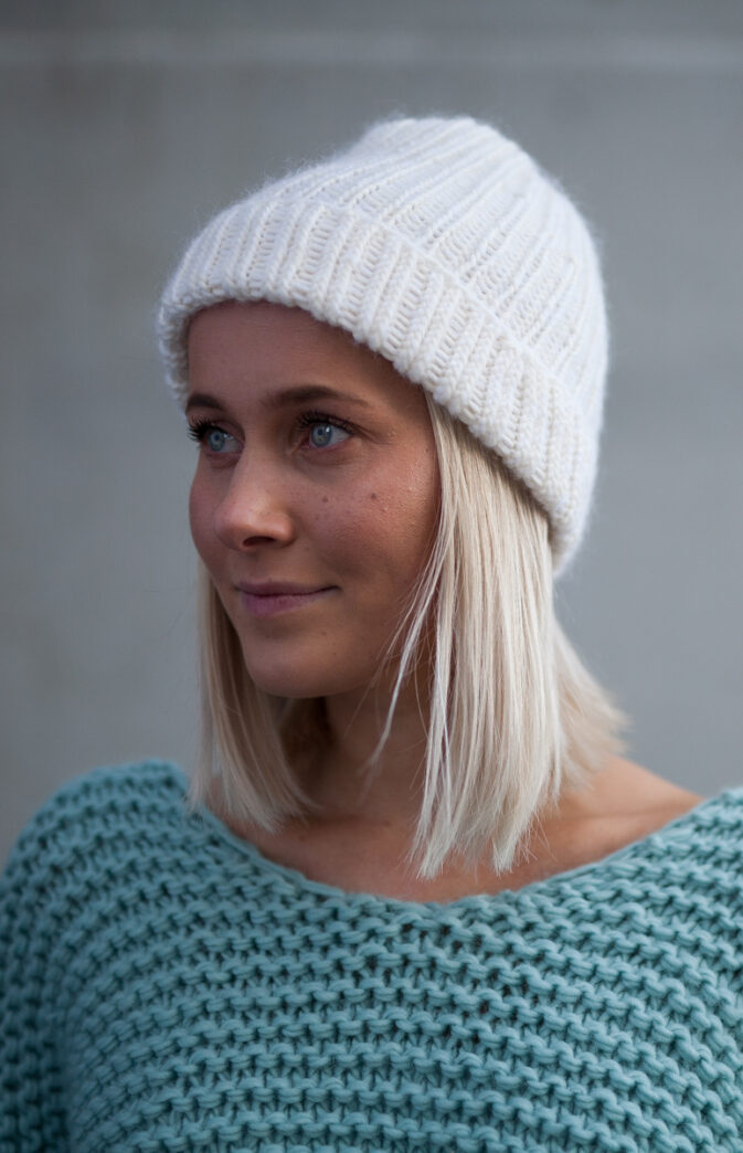 Strikkepakke med garn og gratis digital strikkeoppskrift. Ribbestrikket lue til dame. Enkel strikkelue som kan brukes begge veier. Strikket med en tråd Hip Wool, en tråd Hip Mohair (Hip Mohair kan unnlates). Varm lue med en god passform.
