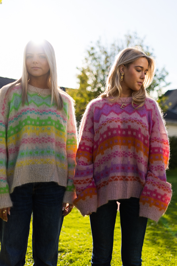 Strikkeoppskrift genser dame. Purple rain – herlig fargerik 80talls genser. Strikkes i 2 tråder Hip Mohair, ovenfra og ned i nydelig mønster. Enkelt diagram som følges hele veien. Genser strikkes i 1 hovedfarge og 5 mønsterfarger – uendelig med variasjoner og unike sammensetninger. Vi har strikket opp i to ulike varianter for å inspirere fargevalg.