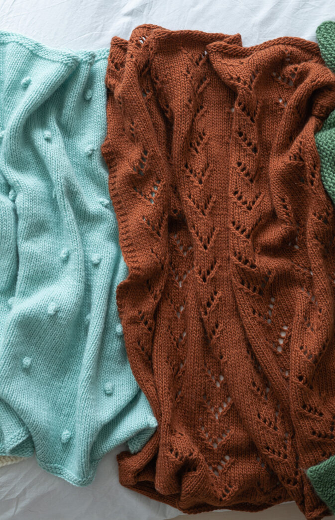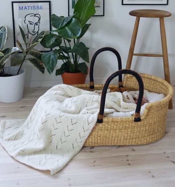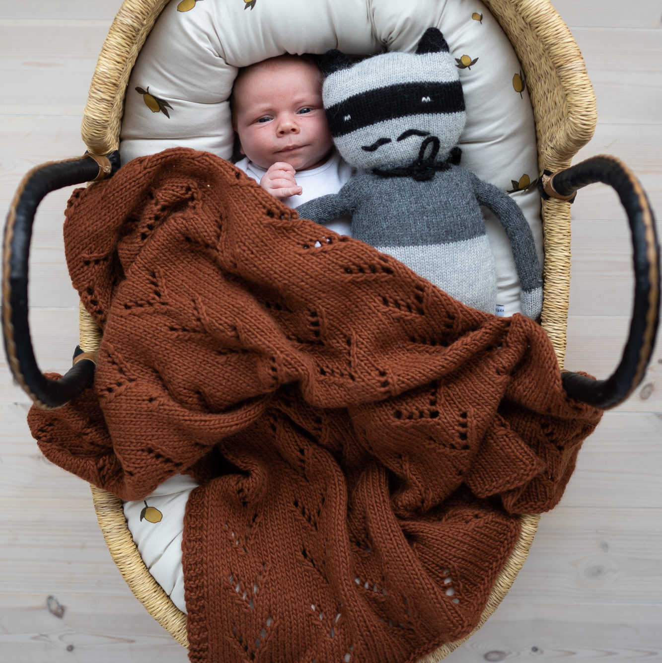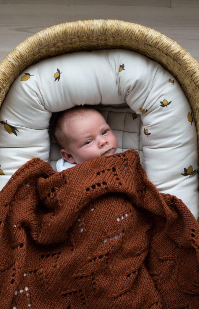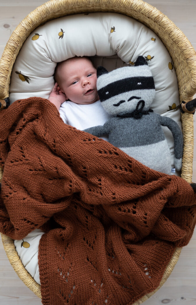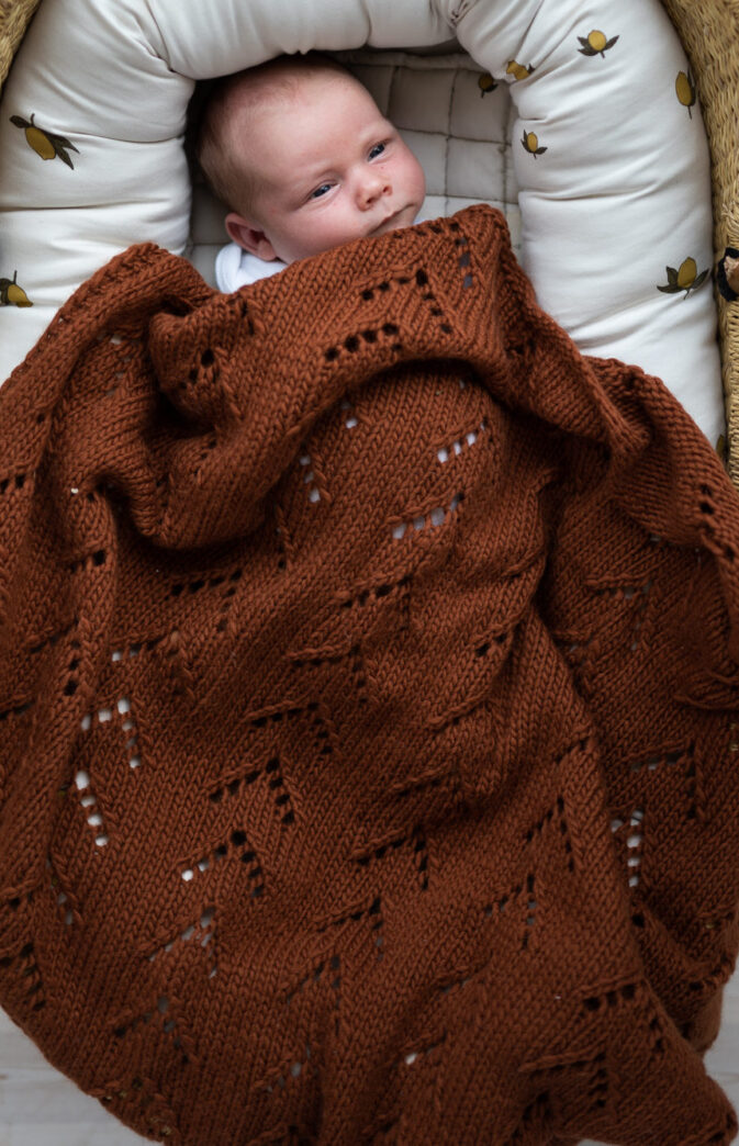 Babyteppe strikkeoppskrift. Nydelig babyteppe med et enkelt dekorativt hullmønster. Farger på bildet: «Coconut white» og «Gingerbread» Hip wool.