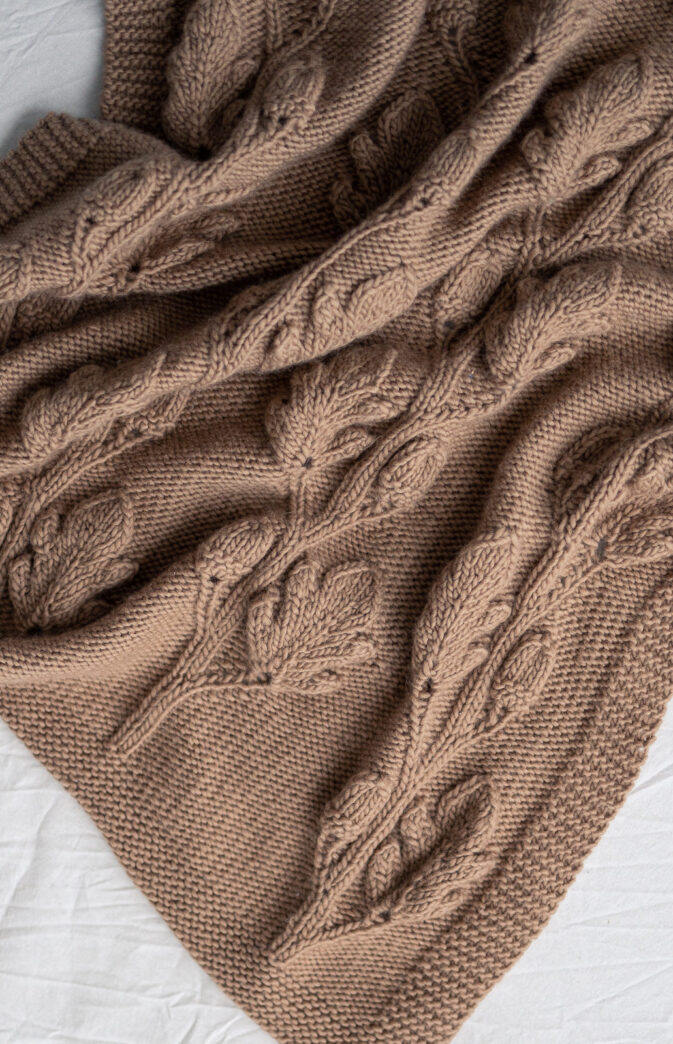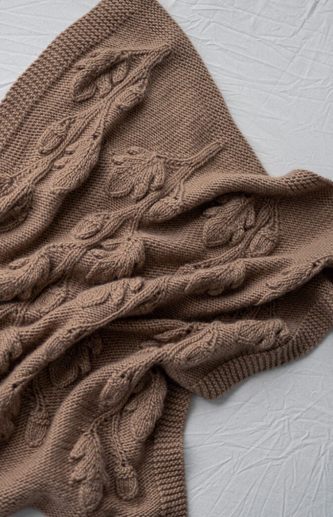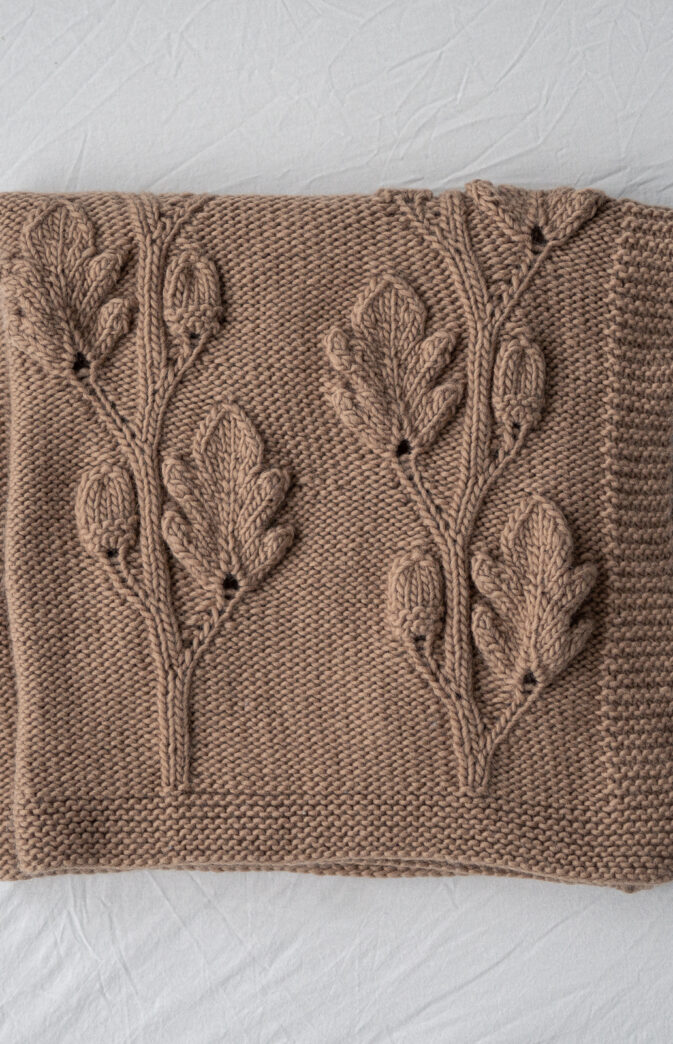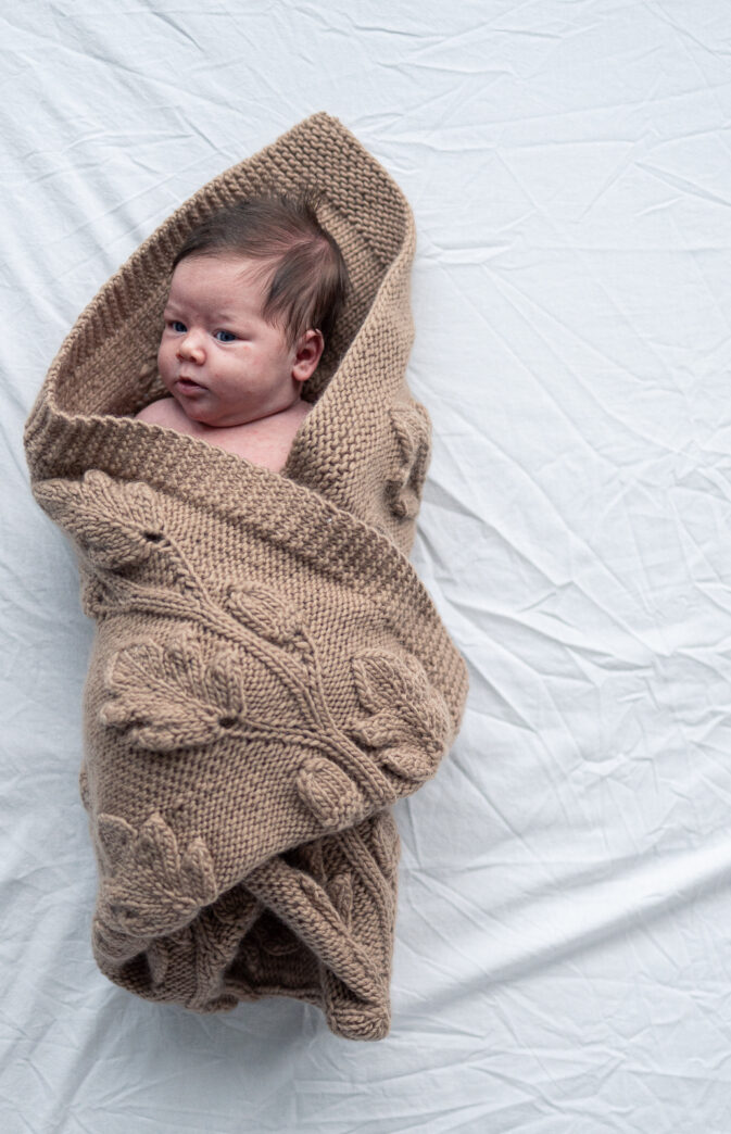 Babyteppe oppskrift i pen strukturstrikk. Strikket i myke Hip Wool, 100 % ull. Teppet er fylt med nydelige eikeblader. Morsomt å strikke, og nydelig teppe som holder den lille varm!
