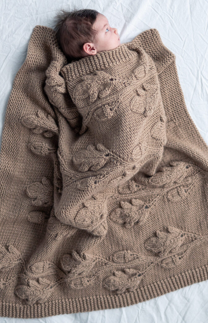 Babyteppe oppskrift i pen strukturstrikk. Strikket i myke Hip Wool, 100 % ull. Teppet er fylt med nydelige eikeblader. Morsomt å strikke, og nydelig teppe som holder den lille varm!