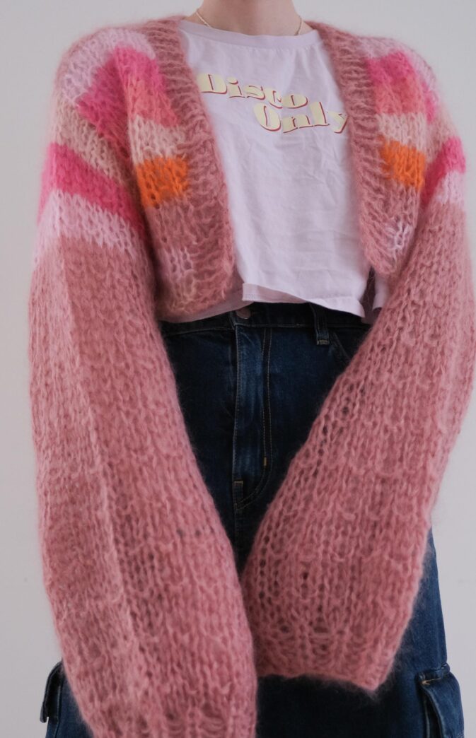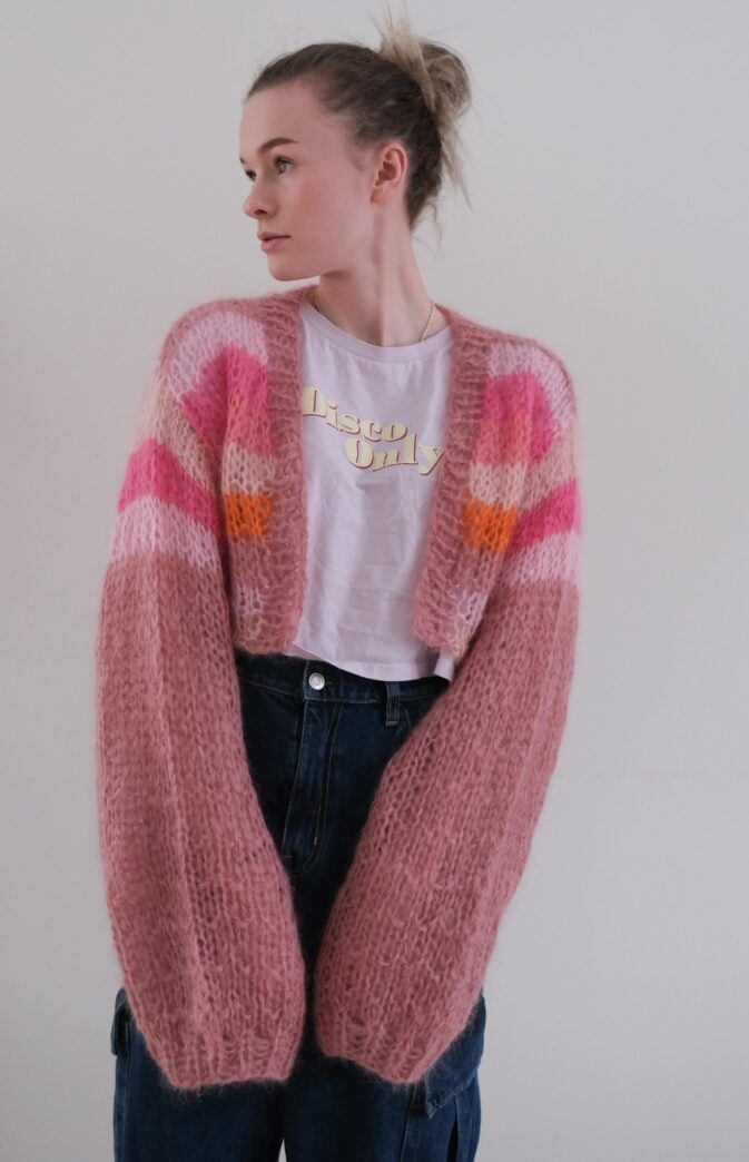 Strikkeoppskrift cardigan til dame i mohair. Kul kort / cropped cardigan strikket i 4 tråder Hip Mohair, nedenfra og opp. Strikket i 4 litt ulike fargetoner for et herlig fargespill.