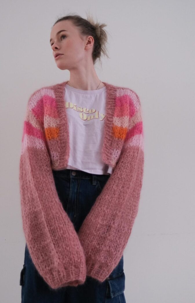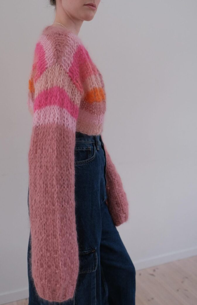 Avbildet i hovedfarge: "I´m Blushing" og striper i “Candyfloss”, “Fairytale Pink”, “Oh la la orange”, “In love Pink” og "Raspberry Pink" Hip Mohair. Modell er 169 cm høy str S, iført str S.