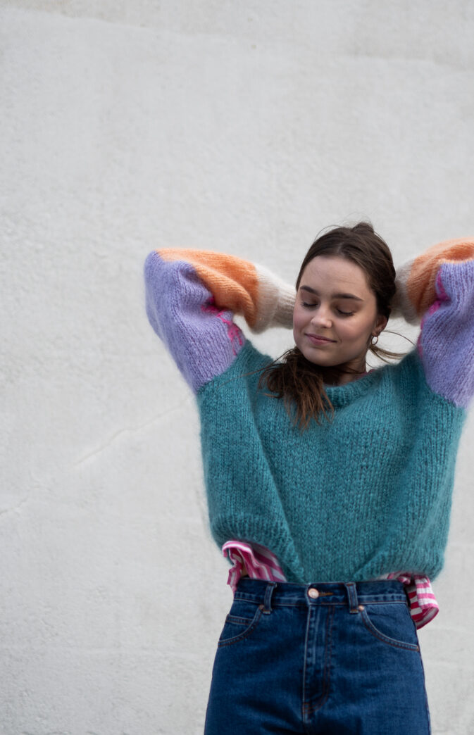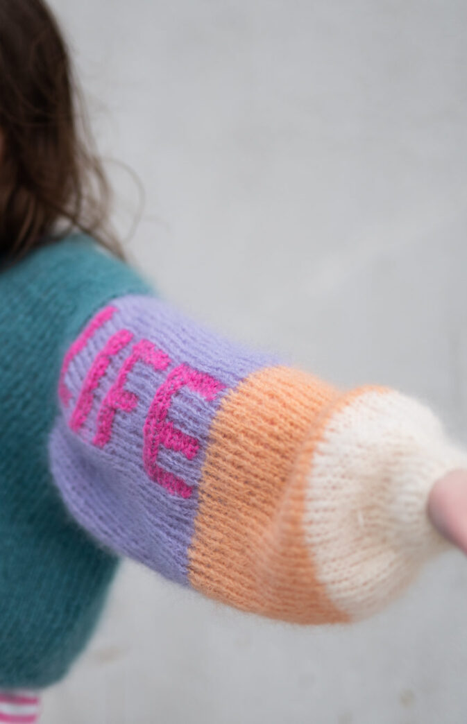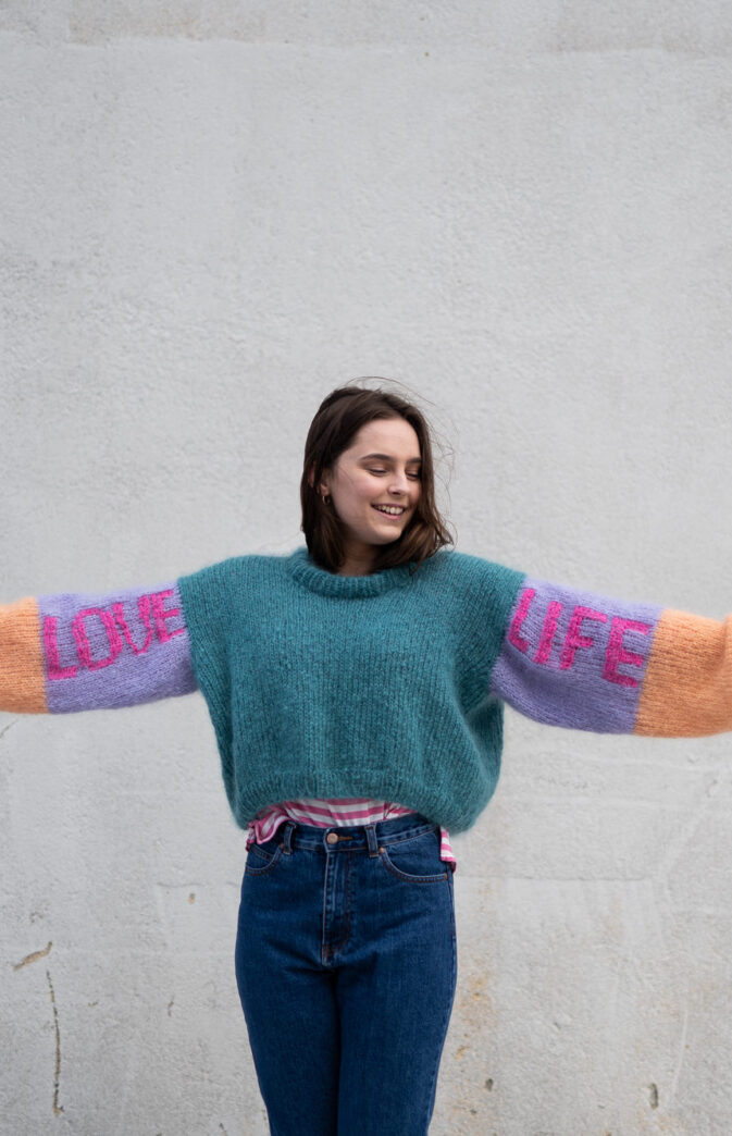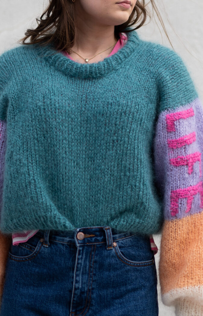 Vi elsker 80-tallet! Morsom og lettstrikket genser i nydelige farger. Passformen er kort og bred, med vide ermer. Lag genseren med eller uten broderte bokstaver. Diagram på bokstaver er inkludert i mønster.