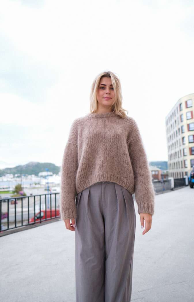 Digg og fluffy strikkeoppskrift på genser strikket i dobbel tråd Fluff mohair.