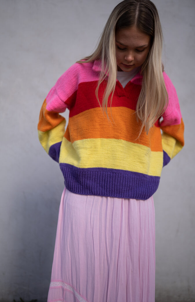 Avbildet i str S stripet versjon i farge 1 "Pink Crush", 2 "Juicy red", 3 "On fire orange", 4 "Summer Vibes yellow" og 5 "Playful Purple" på modell XS/S, 160 cm høy og ensfarget genser i str L i "Foggy Grey Melange" på modell S/M, 169 cm høy