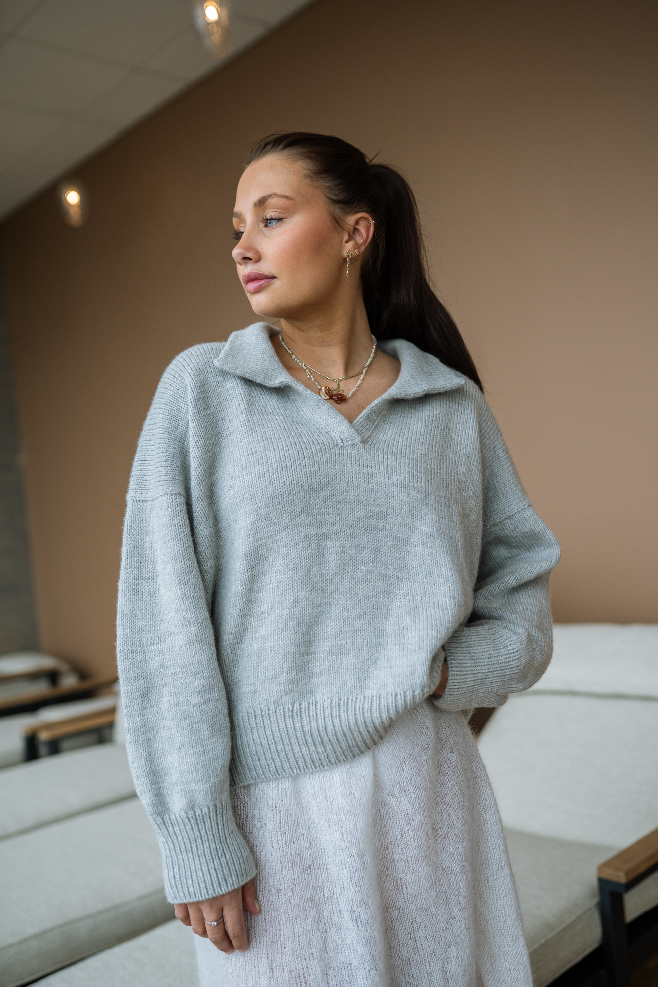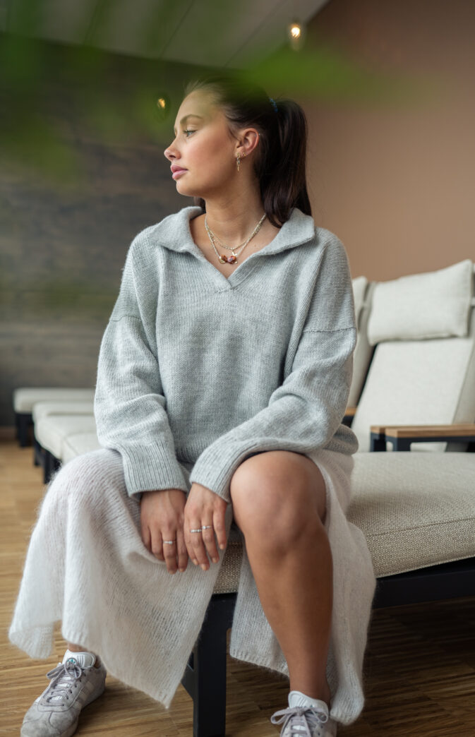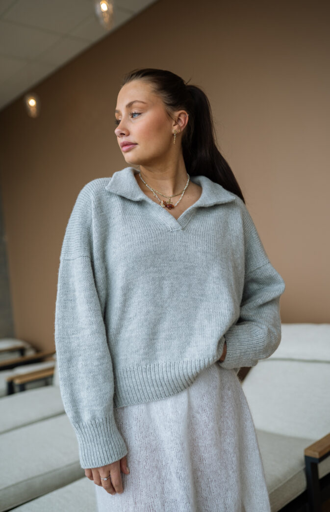 Nydelig genser med krage i Pop Merino. Poloenseren strikkes ovenfra og ned, med fine detaljer som gir et herlig resultat. Du starter på bakstykket. Krage strikkes i dobbelstrikk til sist.