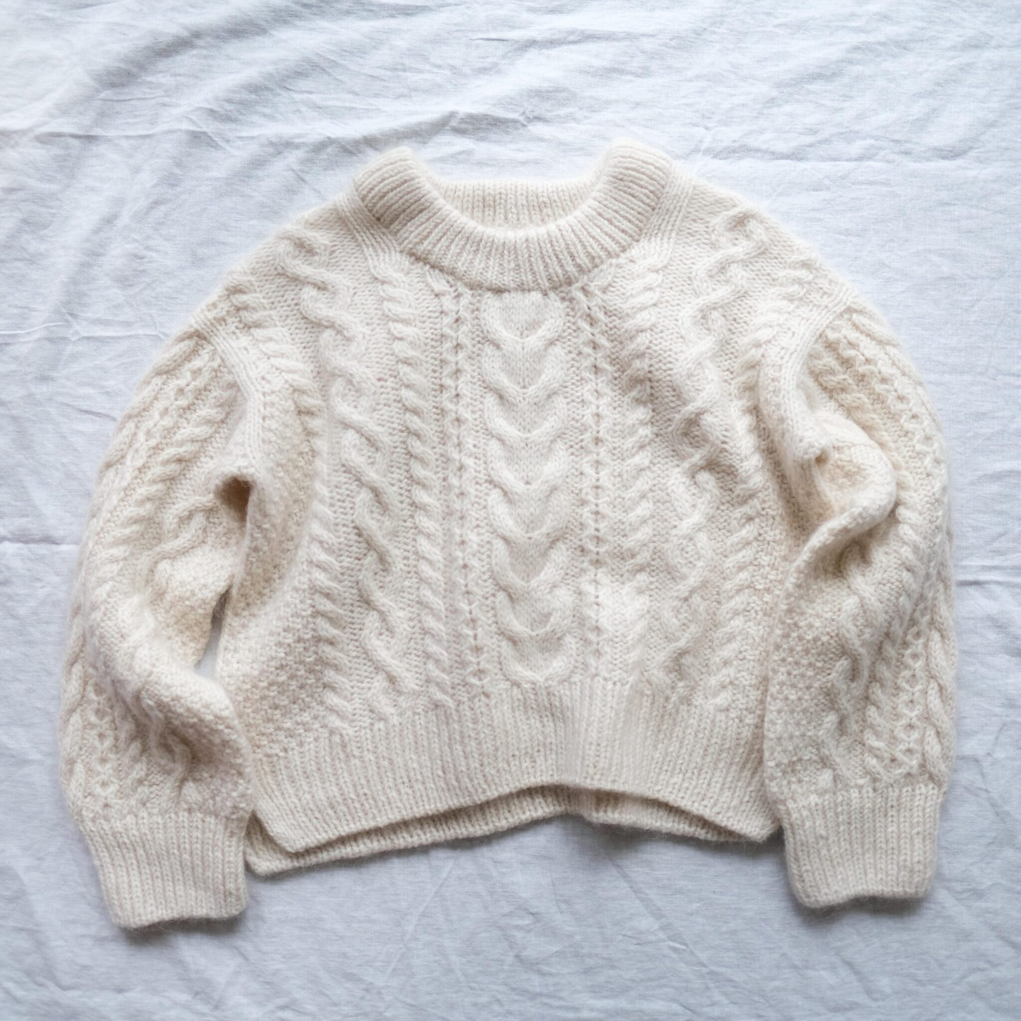 Elegant og vakker flettegenser i Pop Merino og Hip Mohair. En genser i flettestrikk med masse struktur og fine detaljer. Den strikkes ovenfra og ned og det er anbefalt en bevegelsesvidde på + 15 cm.