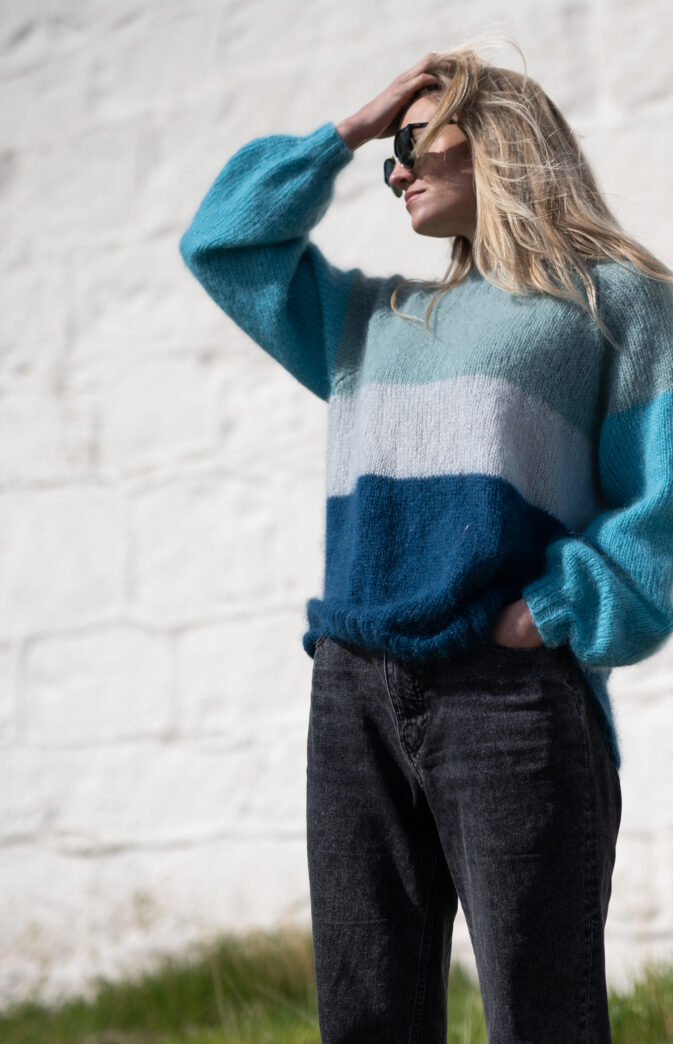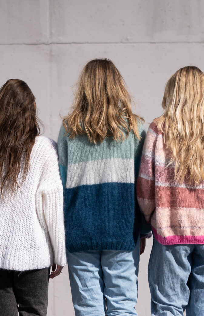 Strikkeoppskrift på kosegenser i mohair. Vår favoritt, jubelgenseren ! Strikket opp i ulike kvaliteter, her i mohair.