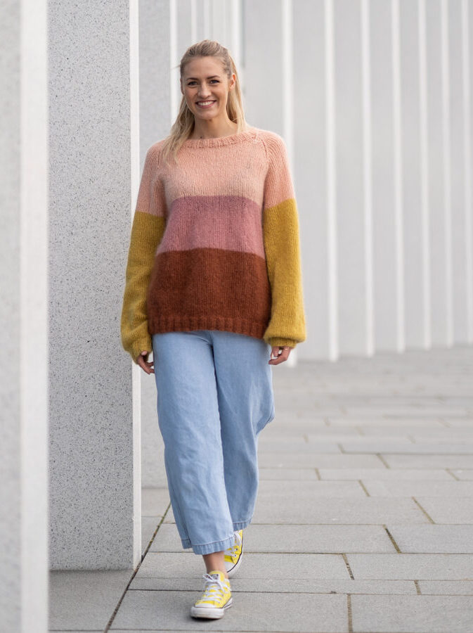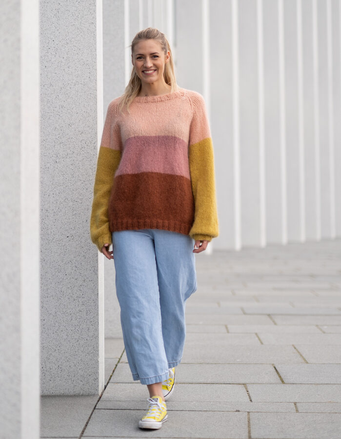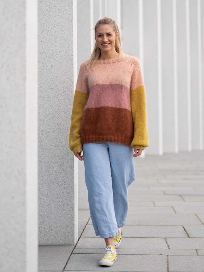 Avbildet i Hip Mohair strikket i 3 tråder "Chocolate Toffee", "I´m blushing", "just peachy" og "Honey dream" (str L)