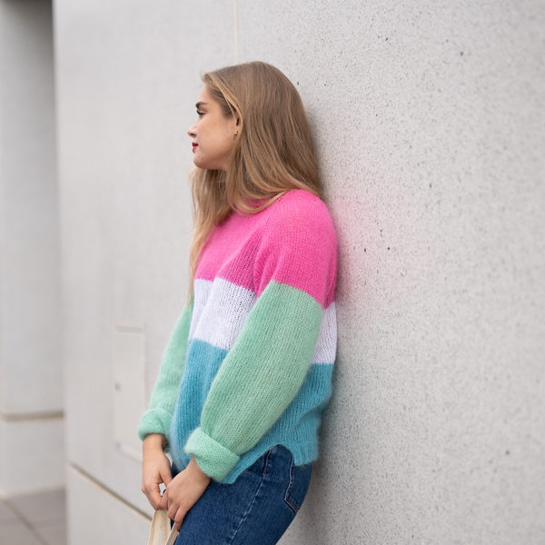 Strikket med 3 tråder Hip mohair. Mønsteret inneholder tips for å strikke den med 2 tråder.