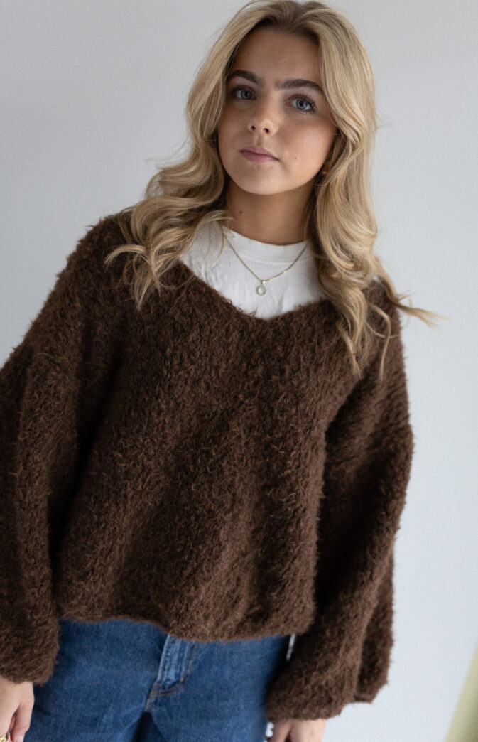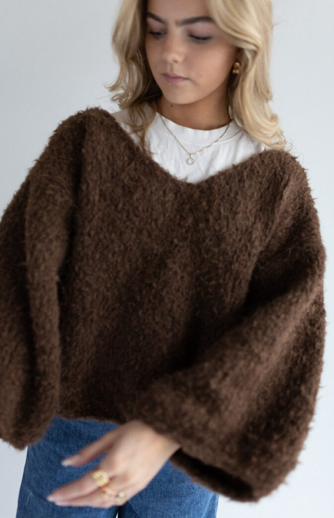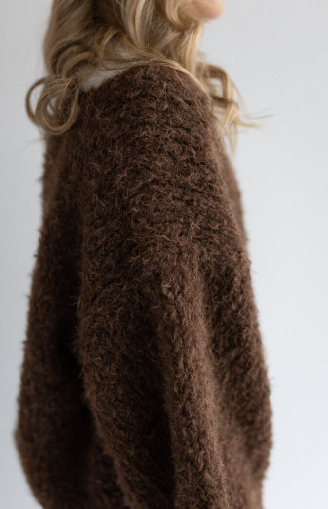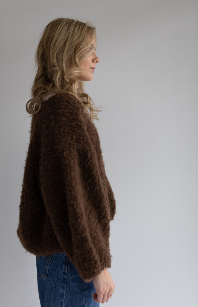 Strikkeoppskrift på kosegenser. Herlig tykk og varm genser strikket i vårt fluffy garn «Wild Wool». Du starter med å strikke genserens rygg, for så å plukke opp masker til skuldre hvor det også økes ut til v-hals. Du kobler etter hvert sammen delene og strikker bolen i ett stykke sammen. Masker ermet plukkes opp til slutt. Oppskriften passer fint til nybegynnere.